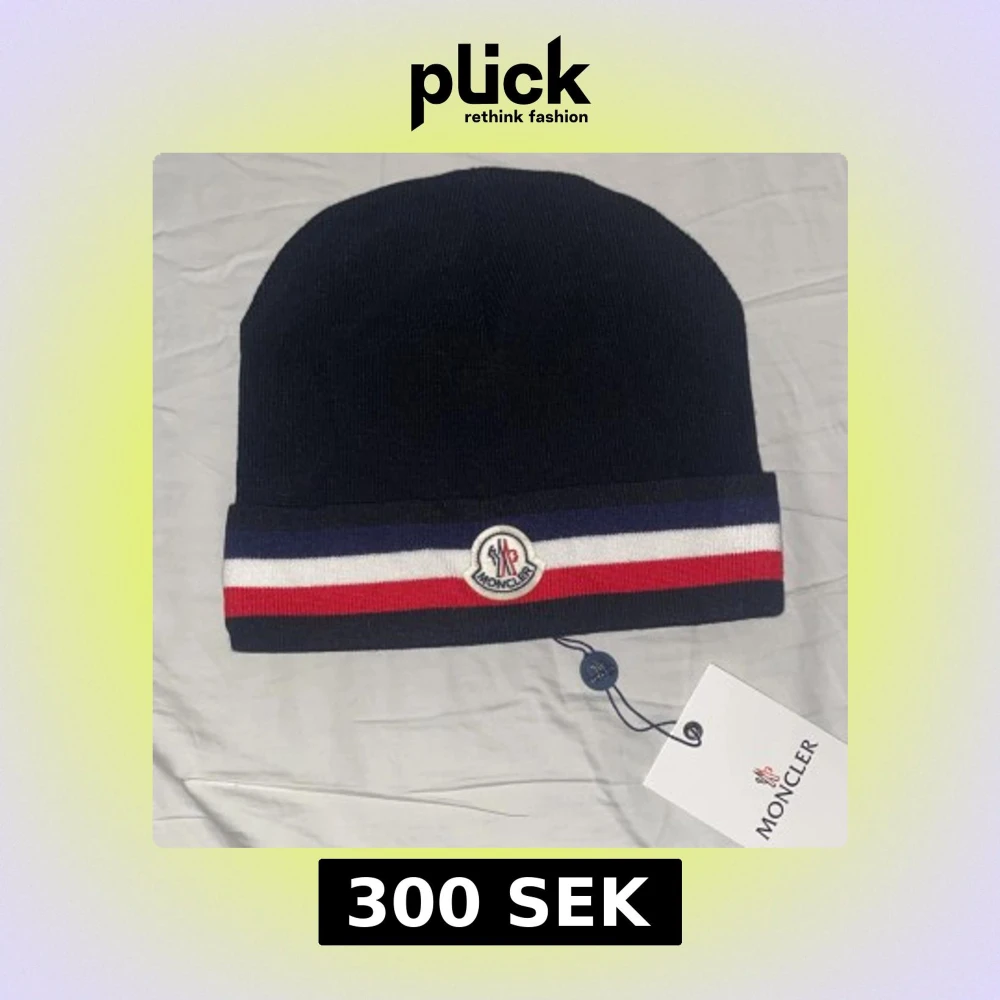 Snygg mörkblå Moncler mössa med breda ränder i blått, vitt och rött längs uppviket. Klassisk Moncler-logga framtill. Stickad i mjukt material som håller dig varm och ger en clean streetstyle-vibe.