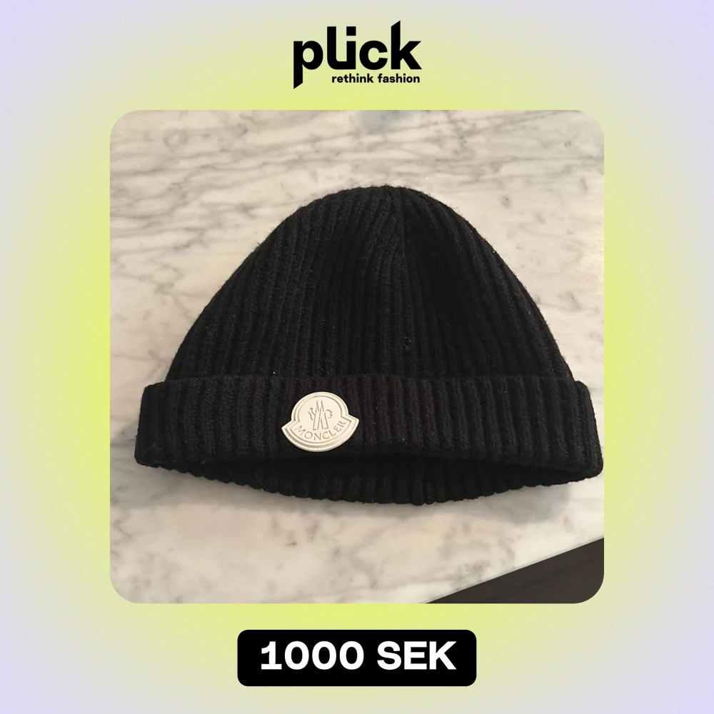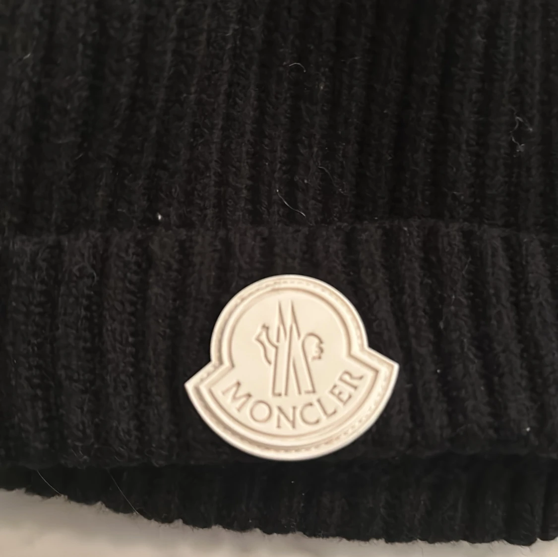 Snygg svart ribbad mössa från Moncler med deras ikoniska logotyp framtill. Perfekt för att hålla värmen under kyliga dagar.