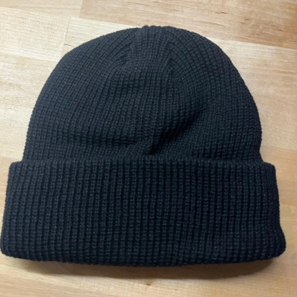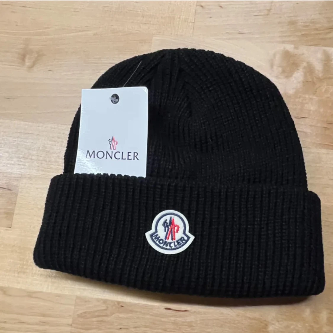 Fet svart ribbstickad mössa från Moncler med uppvikt kant och klassisk Moncler-logga framtill. Nyskick