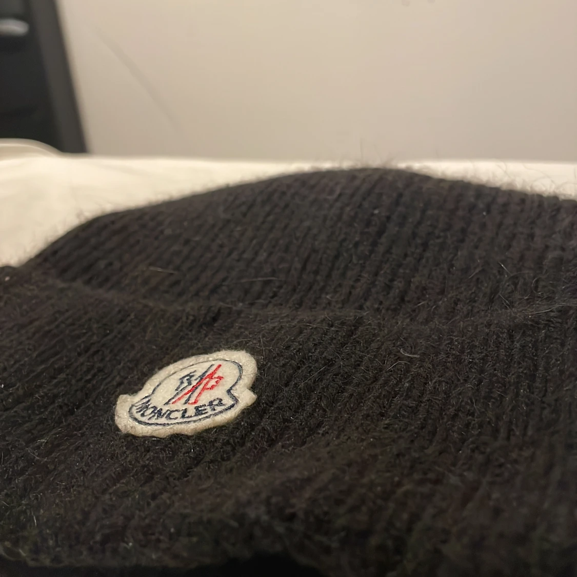 Snygg svart stickad mössa från Moncler med broderad logotyp framtill. Perfekt för att hålla värmen under kyliga dagar. Klassisk design som passar till det mesta.