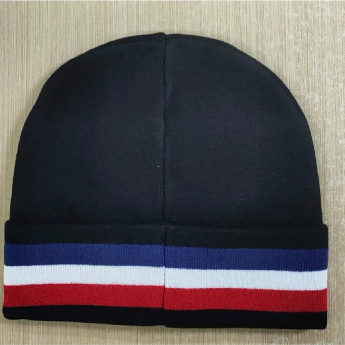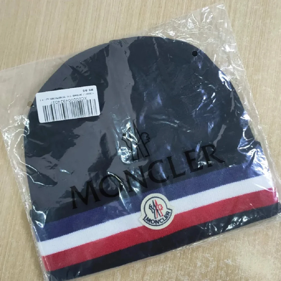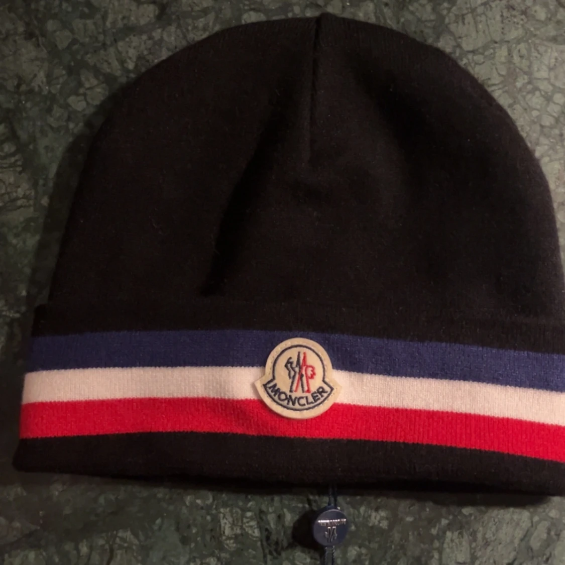 Snygg svart mössa från Moncler med röd, vit och blå randdetalj. Perfekt för att hålla värmen med stil. Märkeslogga framtill ger en exklusiv touch.