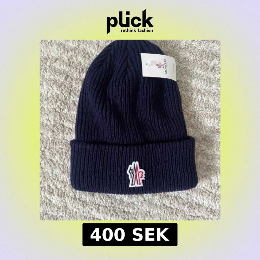 Snygg marinblå mössa från Moncler med ribbad stickning och uppvikt kant. Framtill sitter Monclers ikoniska broderade logga i vitt och rött. Perfekt för dig som vill ha en clean och exklusiv look under kalla dagar.