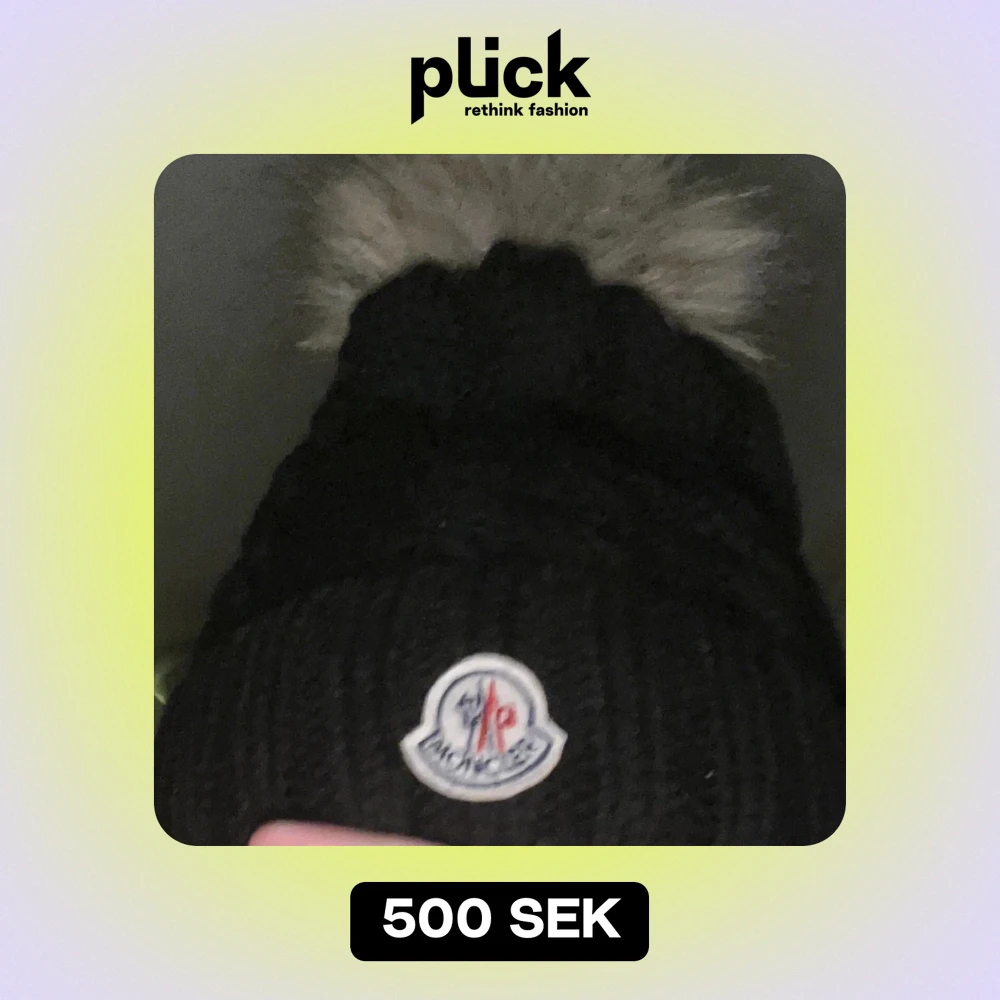Säljer en snygg svart stickad mössa från Moncler med en fluffig pälsboll på toppen. Perfekt för kalla vinterdagar! Mössan har en klassisk design med Moncler-loggan framtill. Supermysig och stilren, passar till allt! 🖤