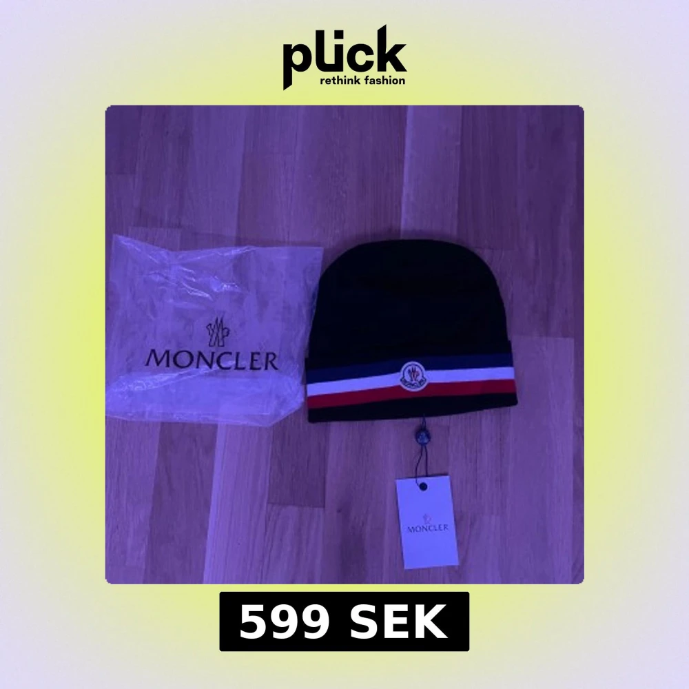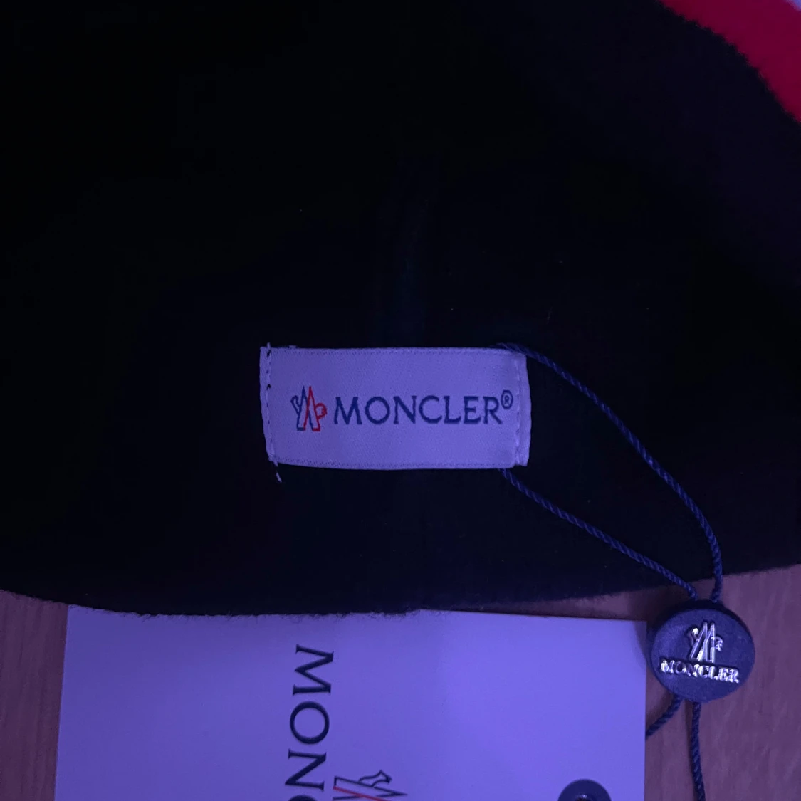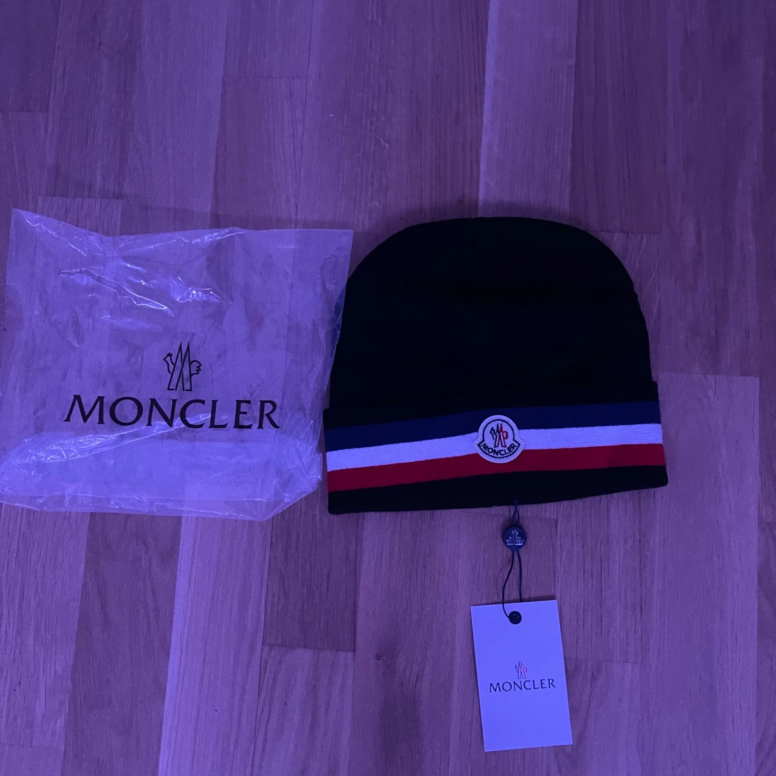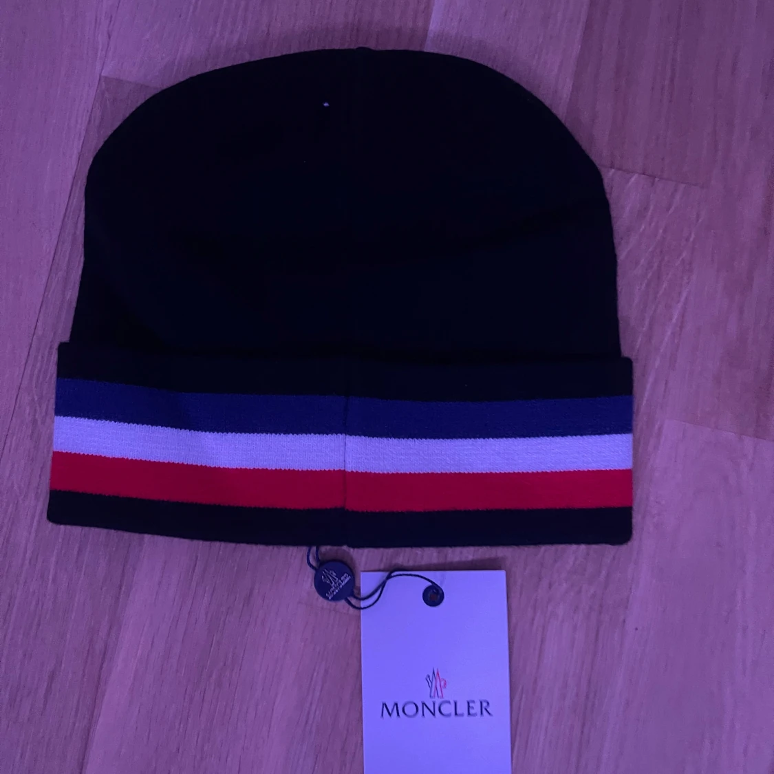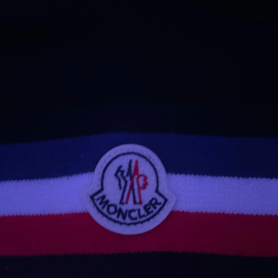Snygg svart mössa från Moncler med röd, vit och blå randdetalj. Mössan har Monclers logotyp framtill och är perfekt för att hålla dig varm med stil. Mycket snygg mössa. Perfket för kyliga dagar! Helt ny aldrig använda! Pris kan diskuteras vid snabb affär!