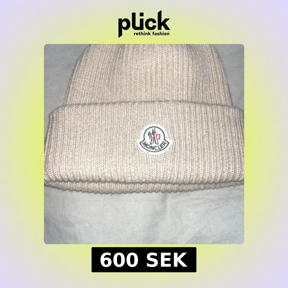 Snygg beige stickad mössa från Moncler med deras ikoniska logga framtill. Perfekt för att hålla dig varm och stilren under kyliga dagar.