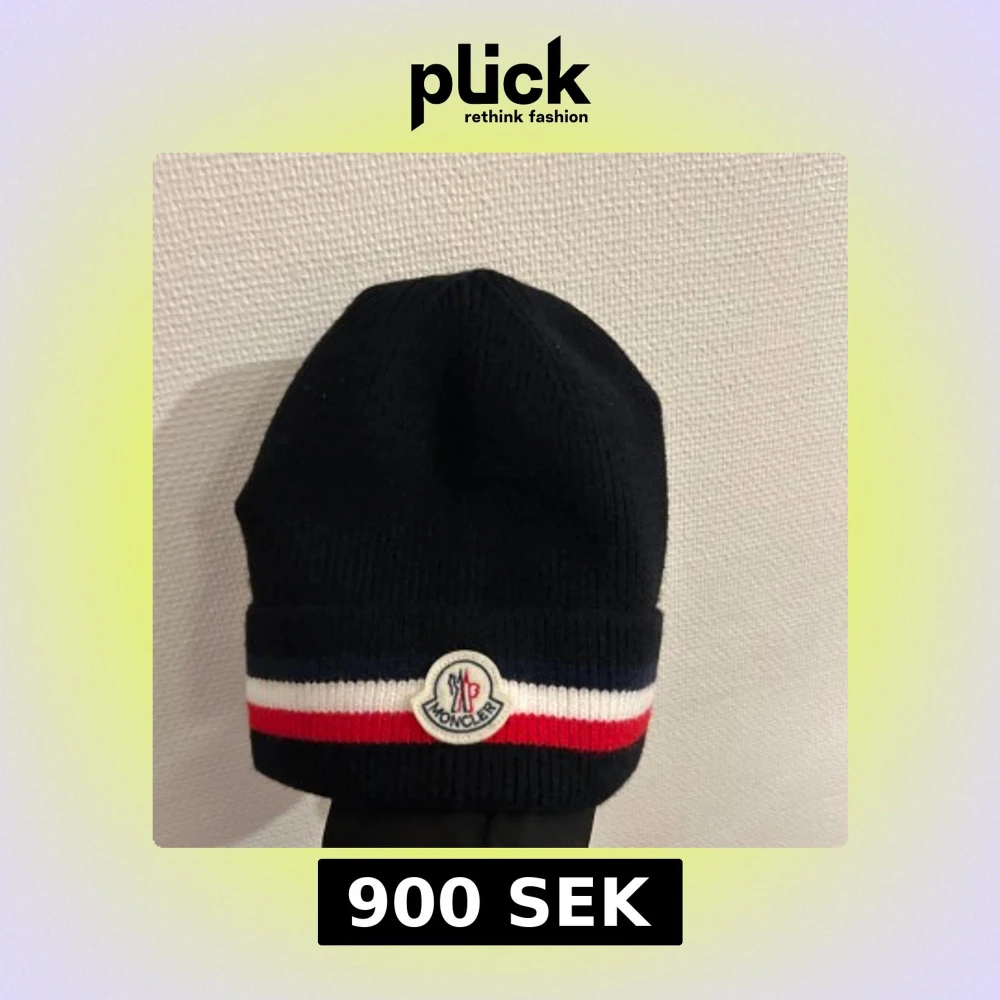 Snygg svart mössa från Moncler med röd och vit randdetalj. Den har en broderad Moncler-logga framtill. Pris kan även diskuteras om ni vill förhandla