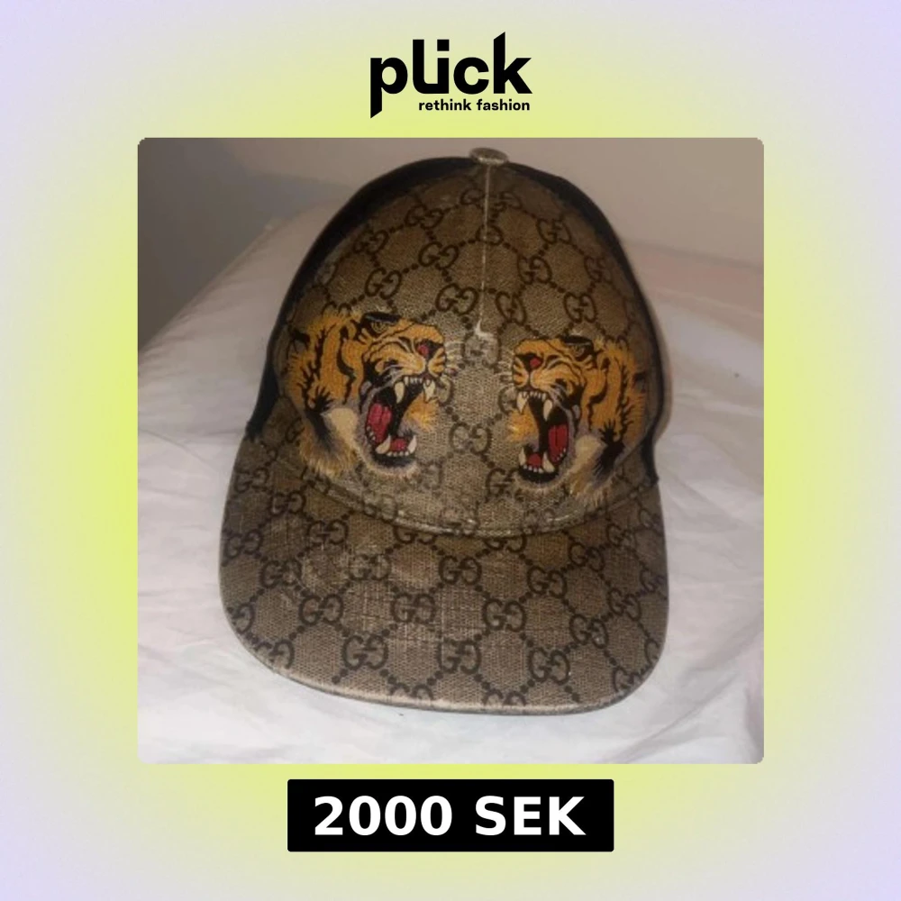 Snygg keps från Gucci med ett djärvt tigertryck på framsidan. Kepsen har ett klassiskt GG-mönster i beige och brunt. Perfekt för att ge din outfit en unik touch. Box och kvitto och alla papper följer med kepsen!!