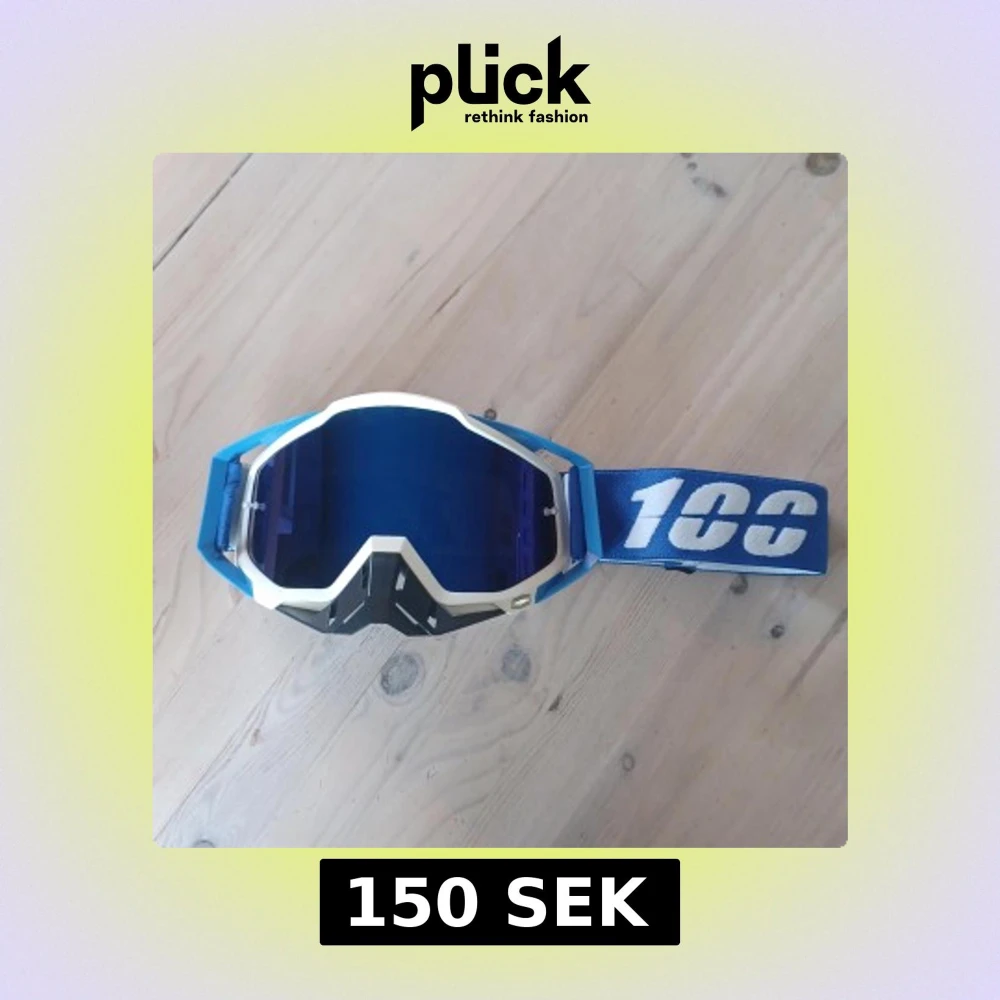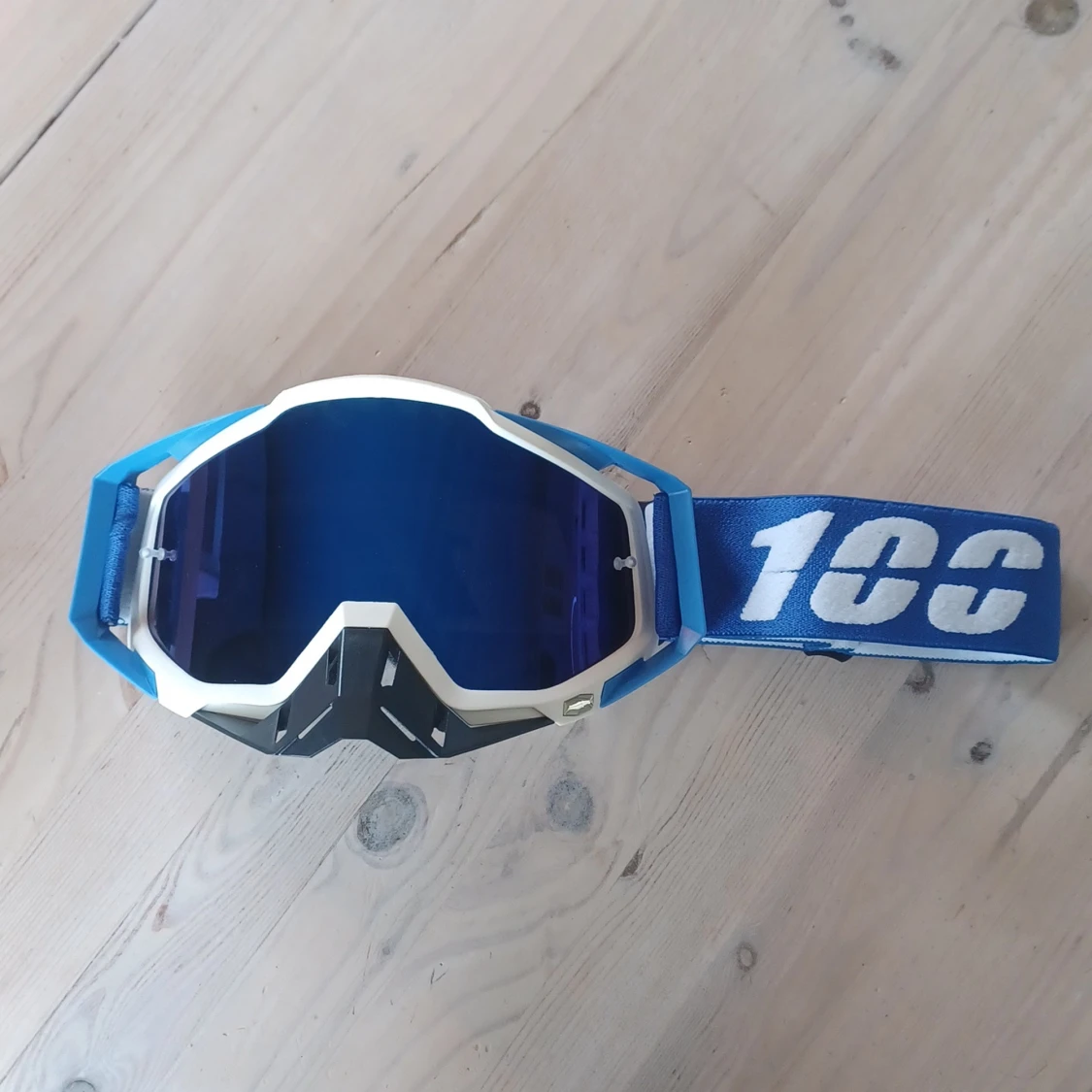 Snygga motocrossglasögon från 100% med blå spegellins, vit och svart ram samt blått band med vit logga. Ramen har en cool, kantig design och bandet är elastiskt för bra passform. Perfekta för dig som vill sticka ut i spåret.