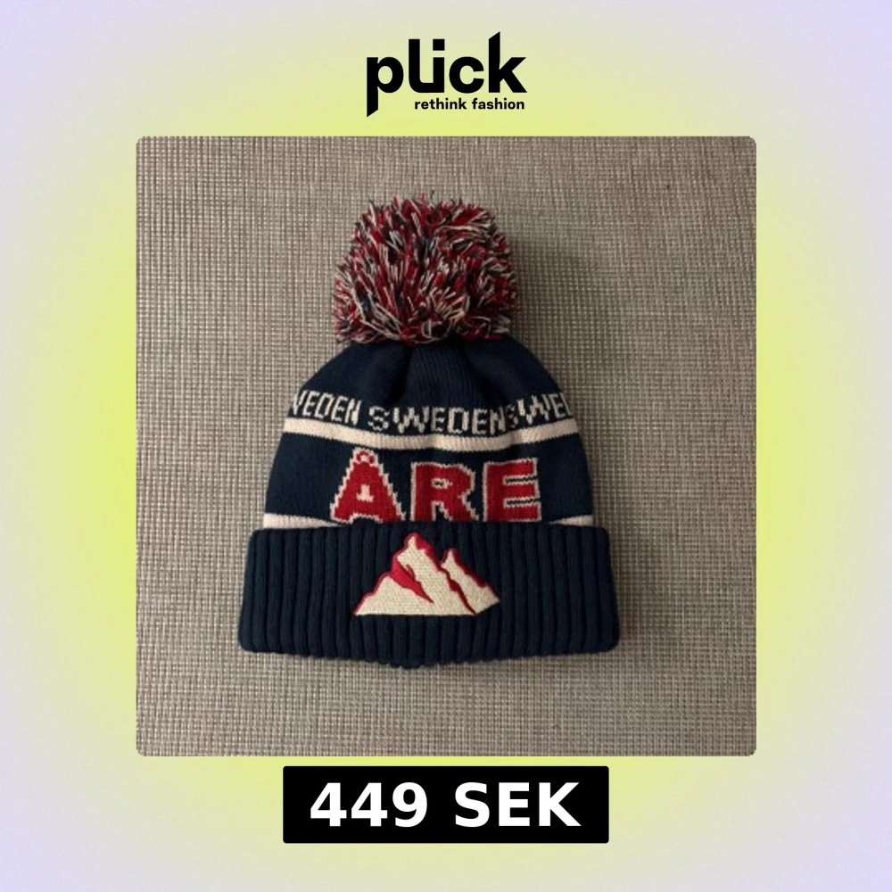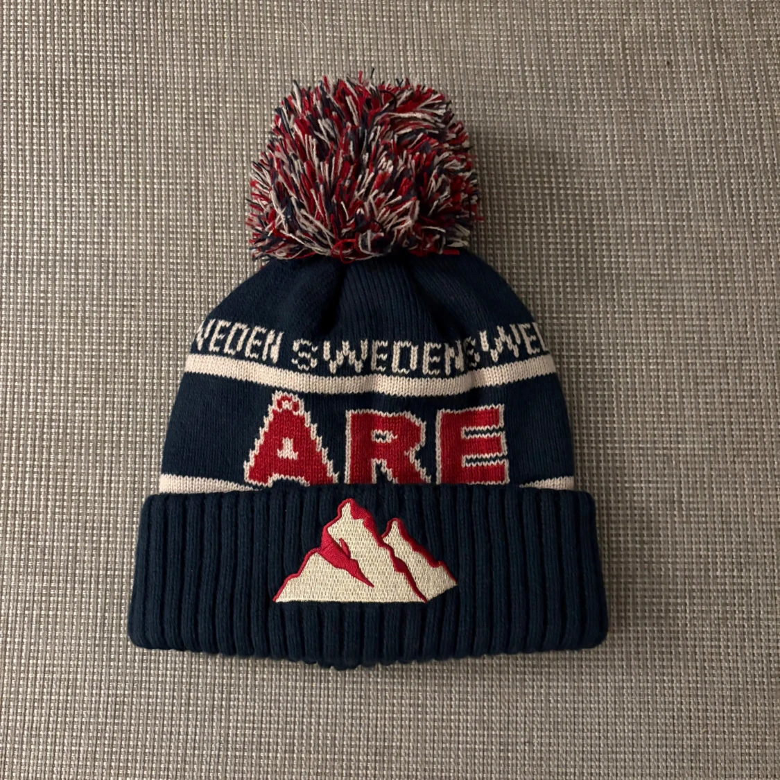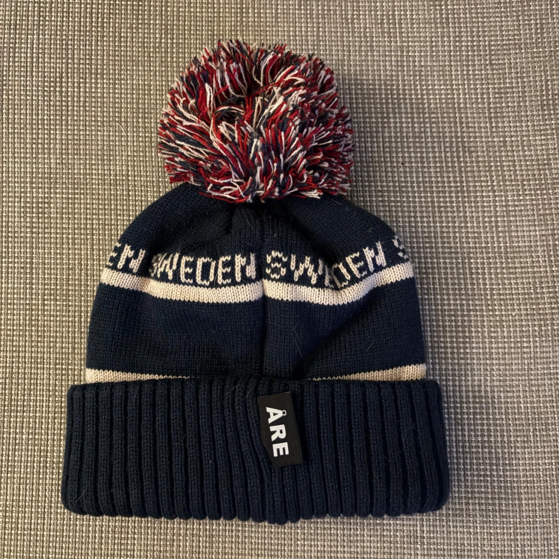 Säljer en mörkblå stickad mössa från Åre med stor röd, vit och blå tofs. Mössan har broderad bergsdetalj och texten 'SWEDEN' samt 'ÅRE' i rött och vitt. Ribbad uppvikning och klassisk vinterstil. Perfekt för kalla dagar och fjällhäng. Den är aldrig andvänd.