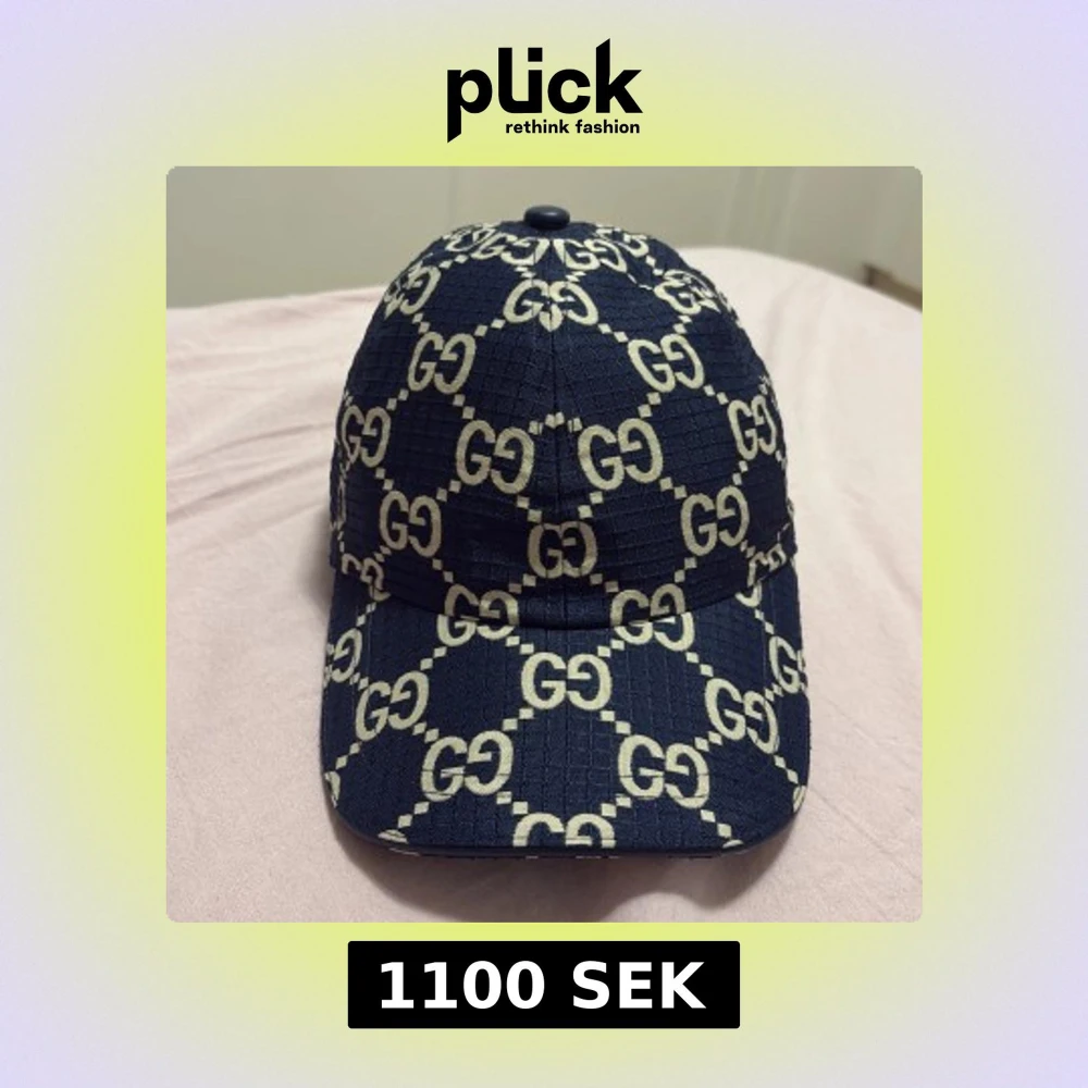 Säljer en mörkblå keps från Gucci med ikoniskt GG-mönster i beige över hela kepsen. Kepsen har justerbar rem baktill i läder med präglad Gucci-logga. Materialet är strukturerat och ger en lyxig känsla. Perfekt accessoar för att lyfta din outfit.
