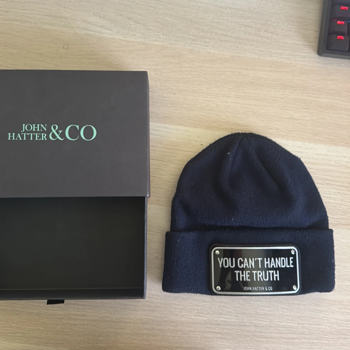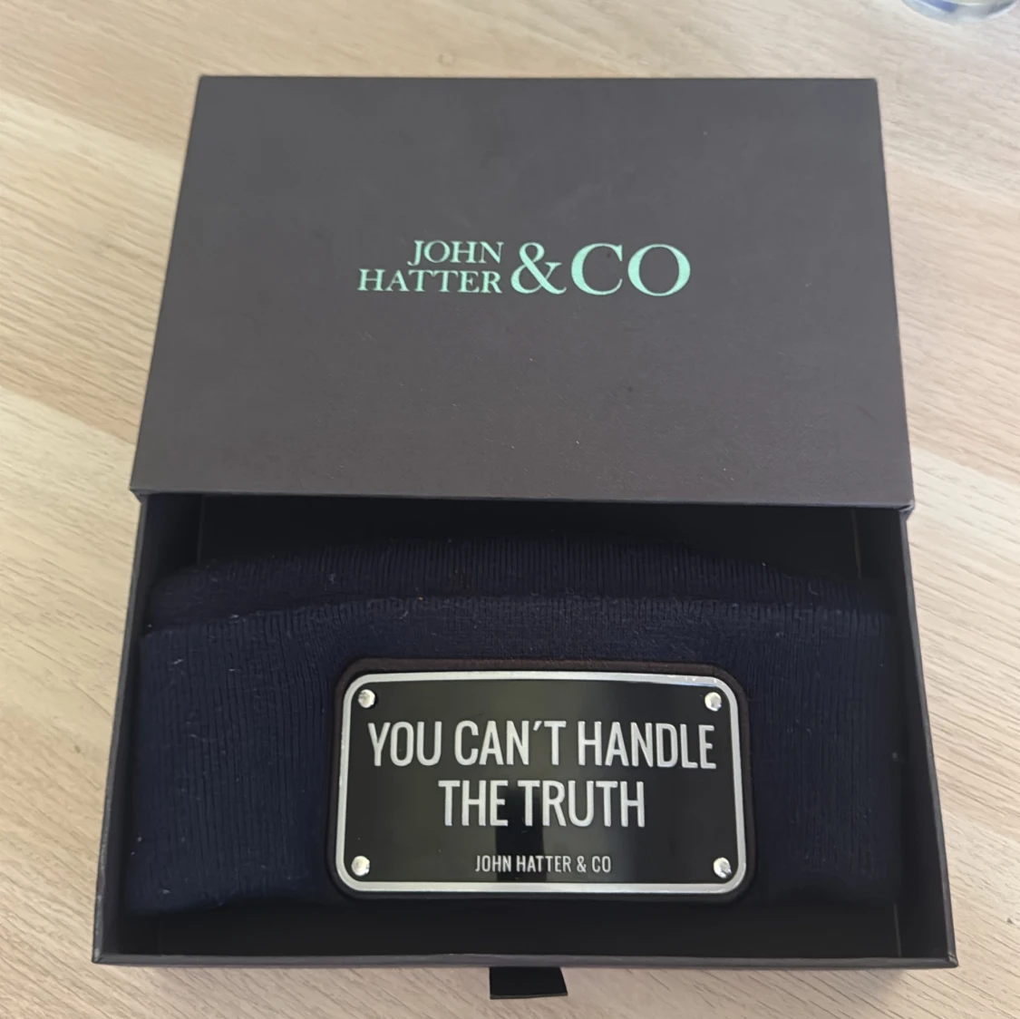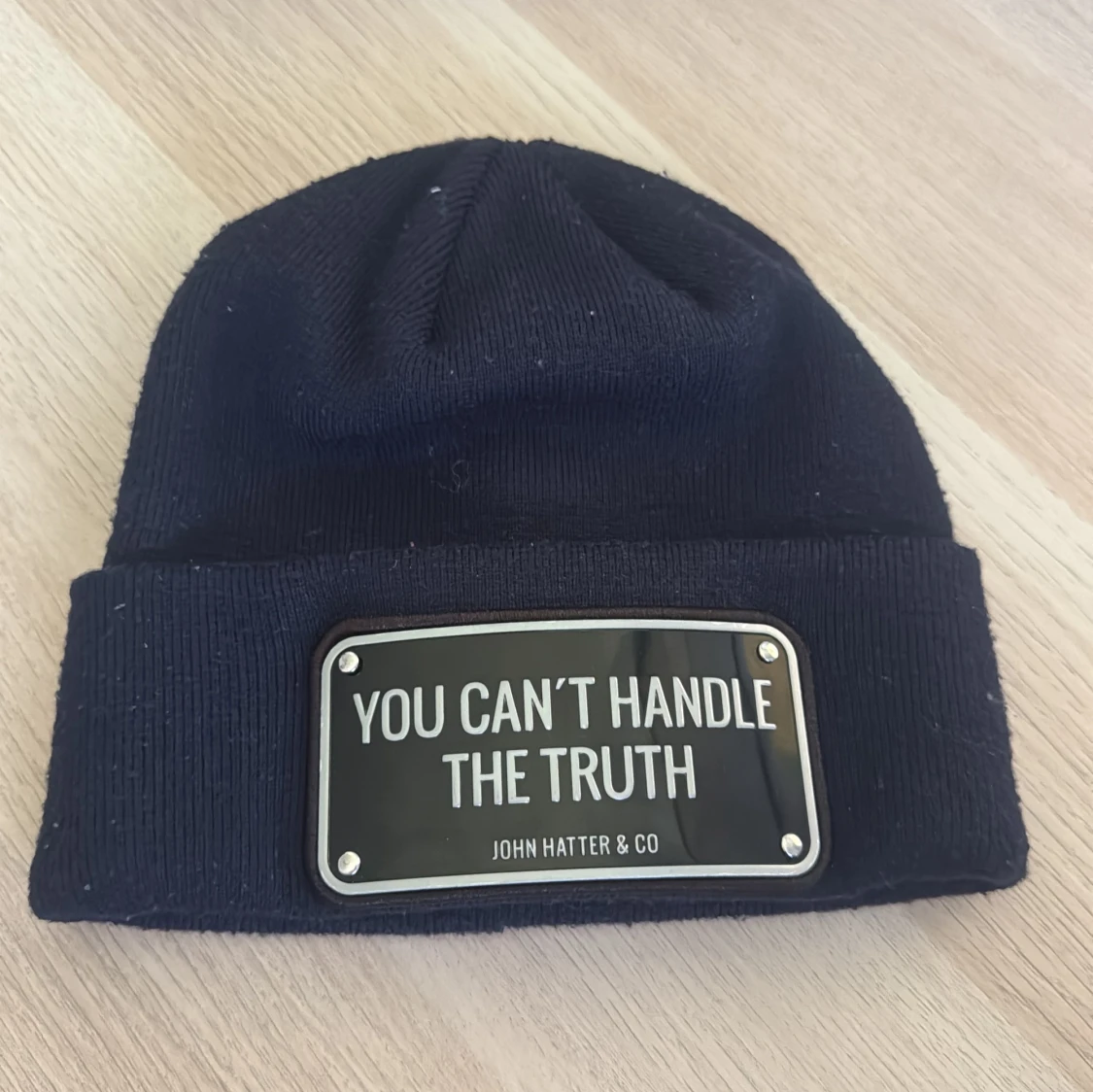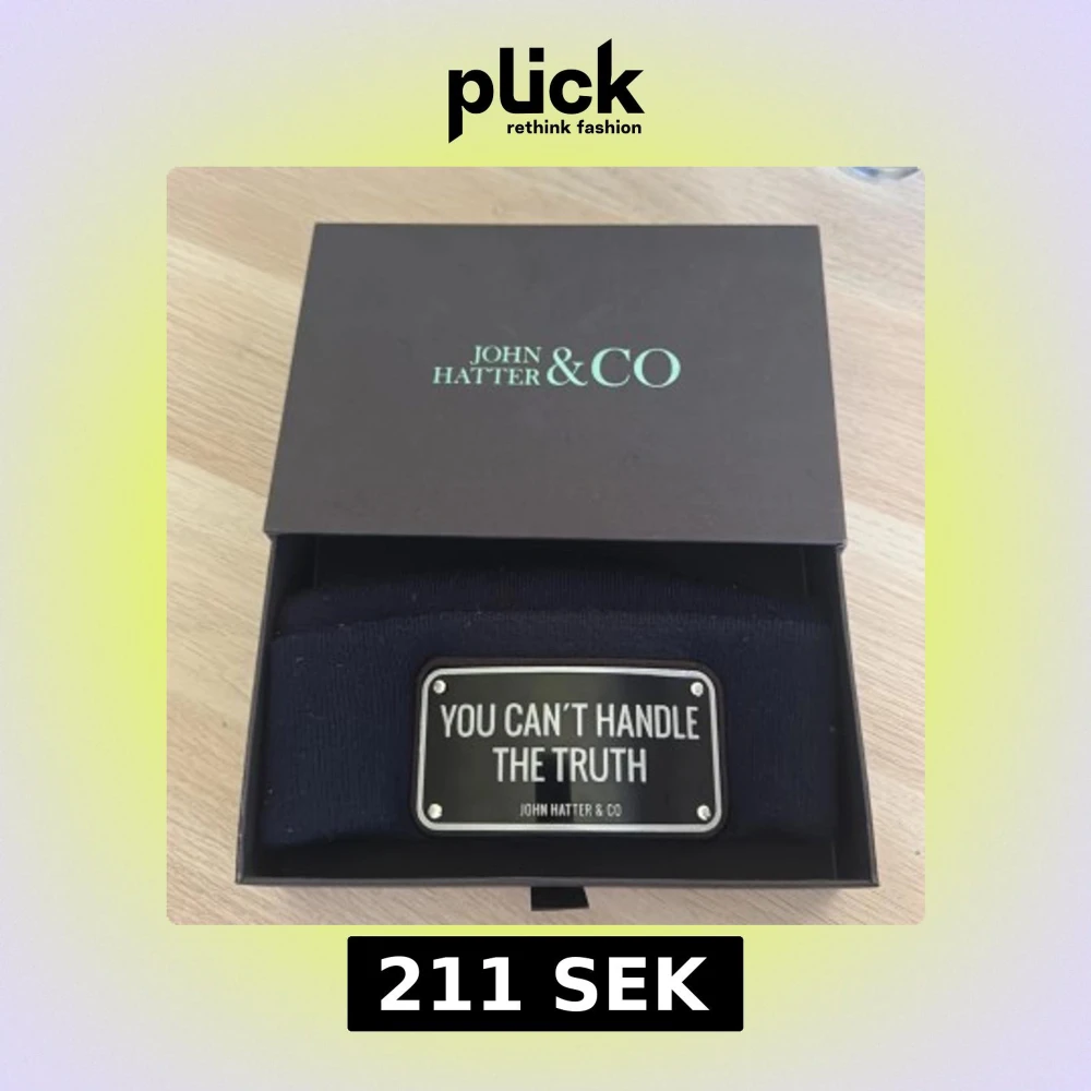 Pris kan diskuteras: droppas av vart som i Stockholm. Cool svart mössa från John Hatter & Co med uppvikt kant och en metallskylt framtill med texten 'YOU CAN'T HANDLE THE TRUTH'. Mössan är stickad och har en stilren, urban vibe som sticker ut. Perfekt accessoar för dig som gillar statement-plagg.
