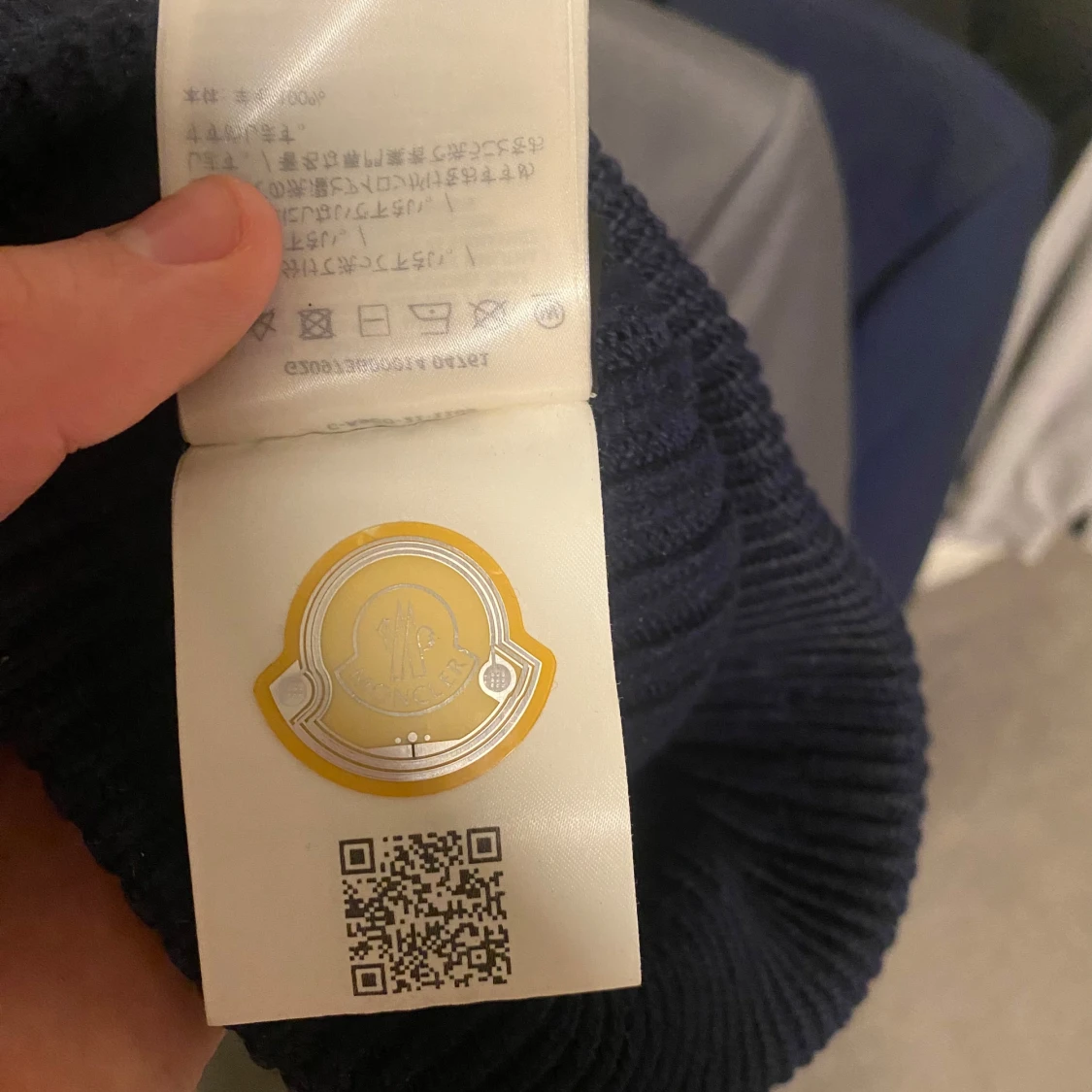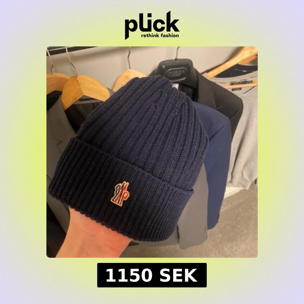Snygg mörkblå ribbad mössa från Moncler med broderad logotyp framtill. Perfekt för att hålla värmen under kyliga dagar. Tillverkad i Italien med högkvalitativt material. Köpt på Saint Garms.