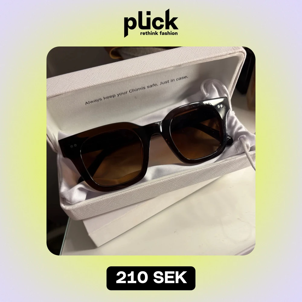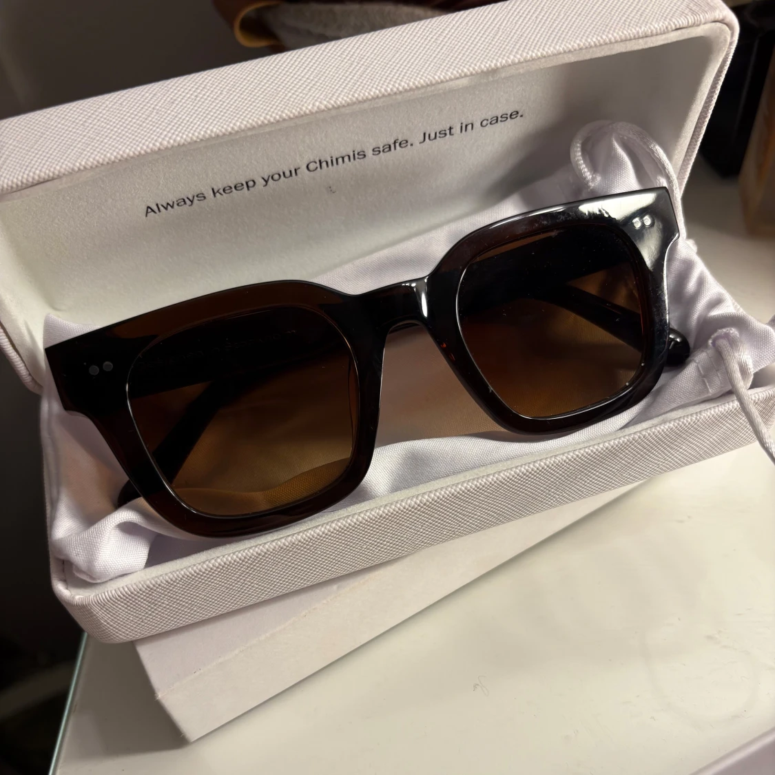 Snygga mörkbruna solglasögon från Chimi med fyrkantig form och bruna linser. Kommer med originalförpackning, fodral och putsduk. Använda fåtal gånger, som nya!