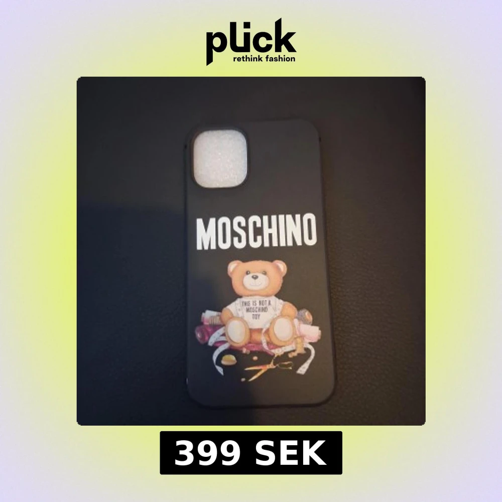 Bilderna visar ett mobilskal från Moschino med en söt nallebjörn och texten 'This is not a Moschino toy'. Det är inte en bok, utan ett mobilskal med trendig design som passar dig som gillar mode och vill sticka ut.