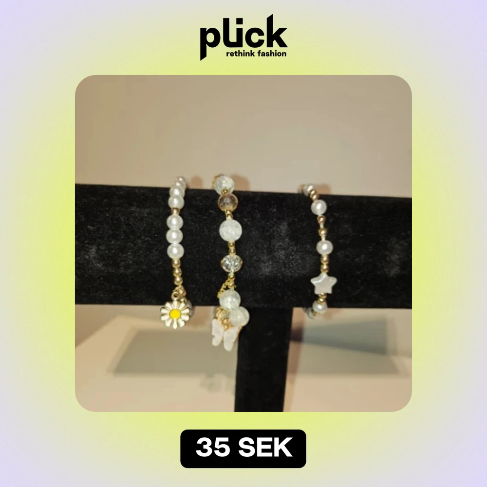 3 st sommar armband med pärlor en med en stjärna på en, en med en fjäril på och en med en blomma, aldrig använda.
