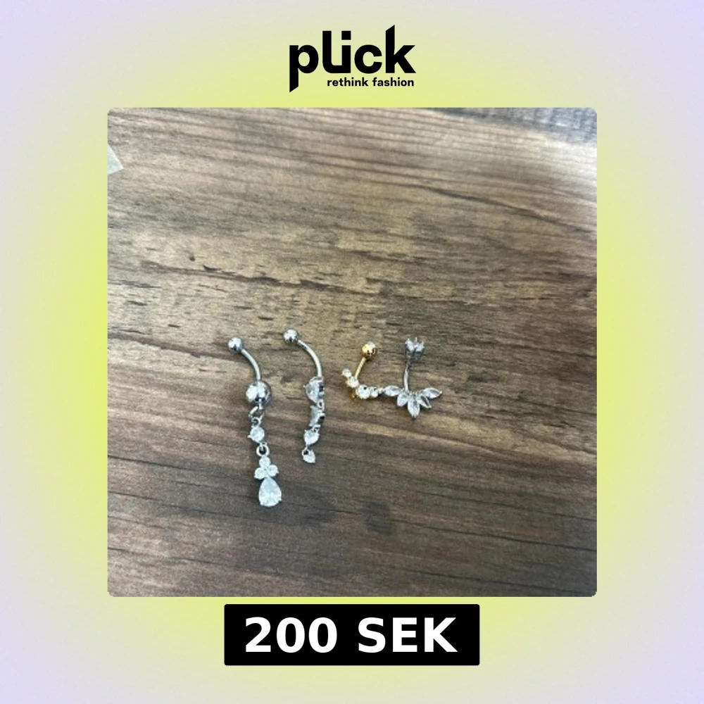 Tre navelpiercingar i silver med glittrande stenar och en i guldfärg med blommig design. Alla gjorda av kiruriskt stål. Aldrig använda💕