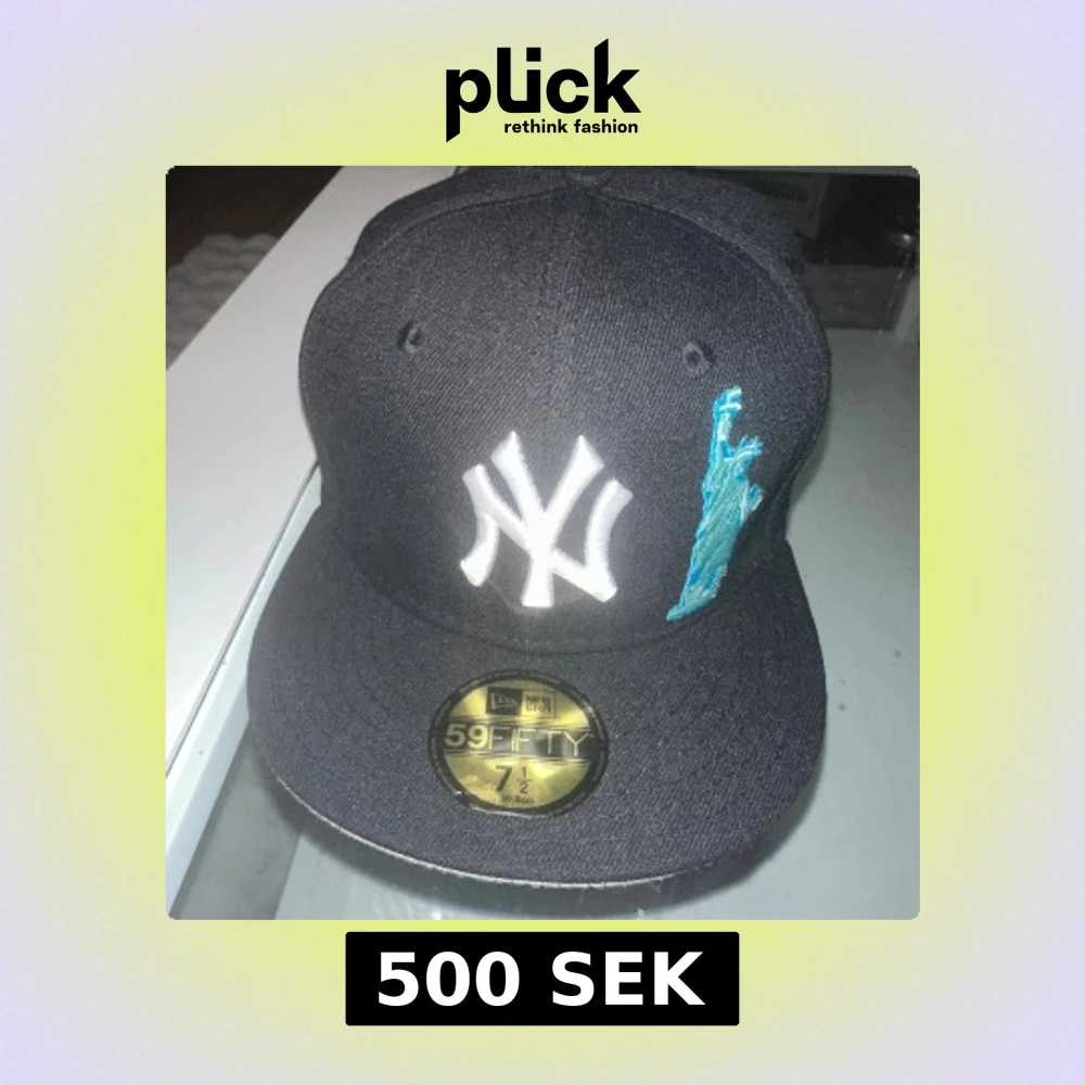 Svart New Era 59FIFTY keps med New York Yankees-logga framtill i vitt, Frihetsgudinnan broderad i blått på sidan och ett rött äpple broderat baktill. Klassisk flat peak och broderade ventilationshål. Perfekt för dig som gillar streetwear och sportig stil.