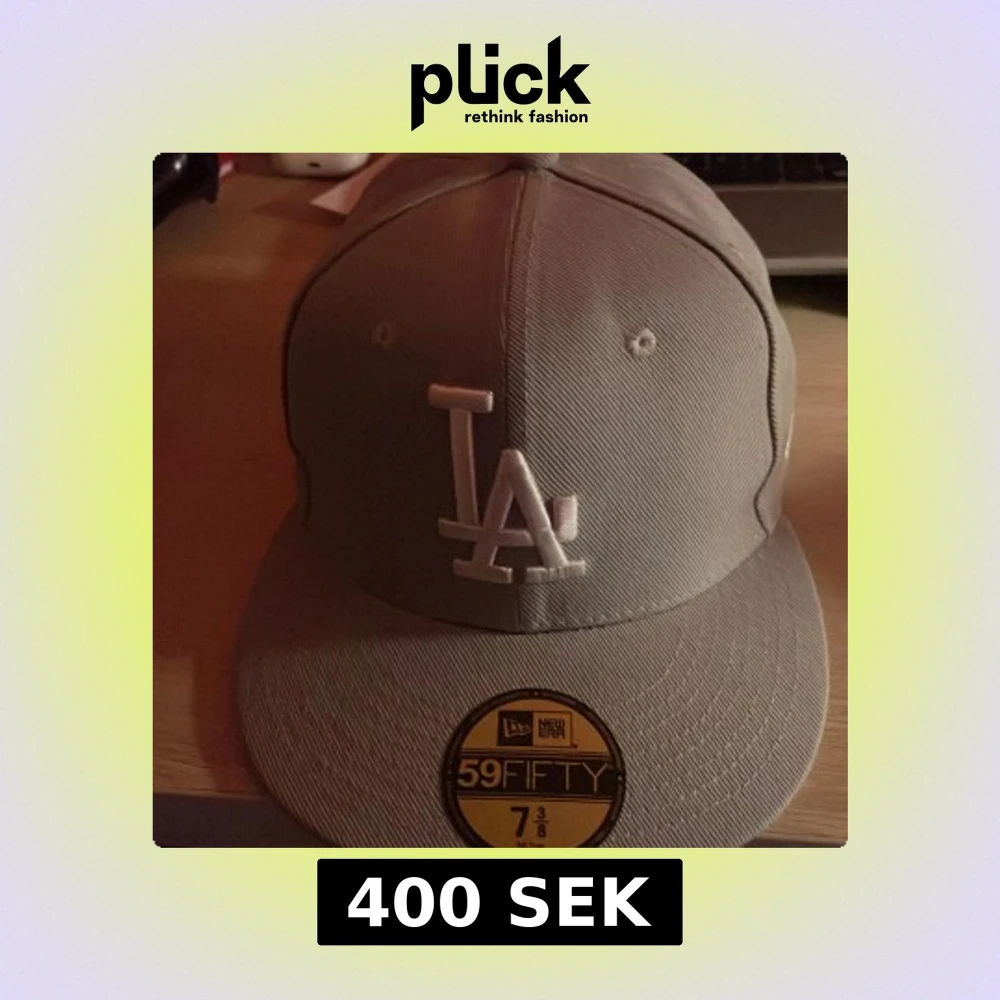 Säljer en stilren grå New Era 59FIFTY keps med LA-logga broderad framtill i vitt. Klassisk flat peak och strukturerad passform. Kepsen är tillverkad i polyester och har märkets signaturdetaljer invändigt. Perfekt för dig som gillar streetwear och sportig stil.
