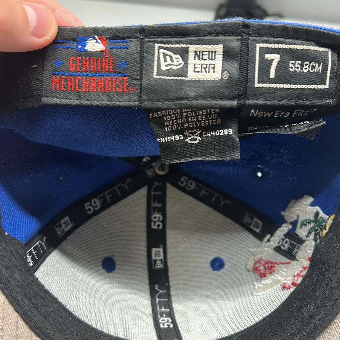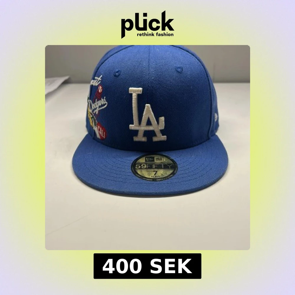 Säljer en blå LA Dodgers 59FIFTY keps från New Era med broderad LA-logga i vitt framtill och MLB-logga baktill. Kepsen har detaljerade broderier på sidan och är tillverkad i 100% polyester. Perfekt för dig som gillar sportig streetstyle och baseball.