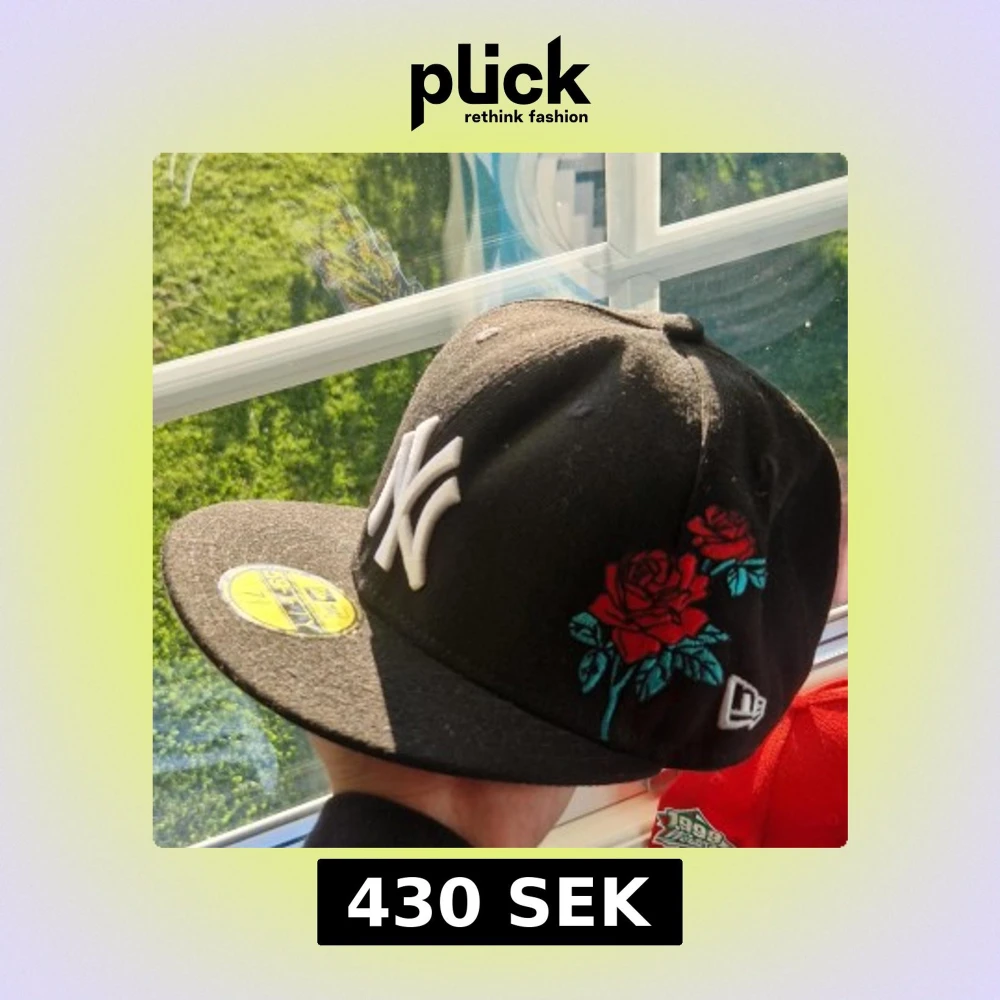 Snygg svart keps från New Era med klassisk NY-logga framtill i vitt och broderade röda rosor med gröna blad på sidan. Flat skärm och gul storleksdekal kvar på skärmen. Perfekt för dig som vill sticka ut med en unik streetstyle.