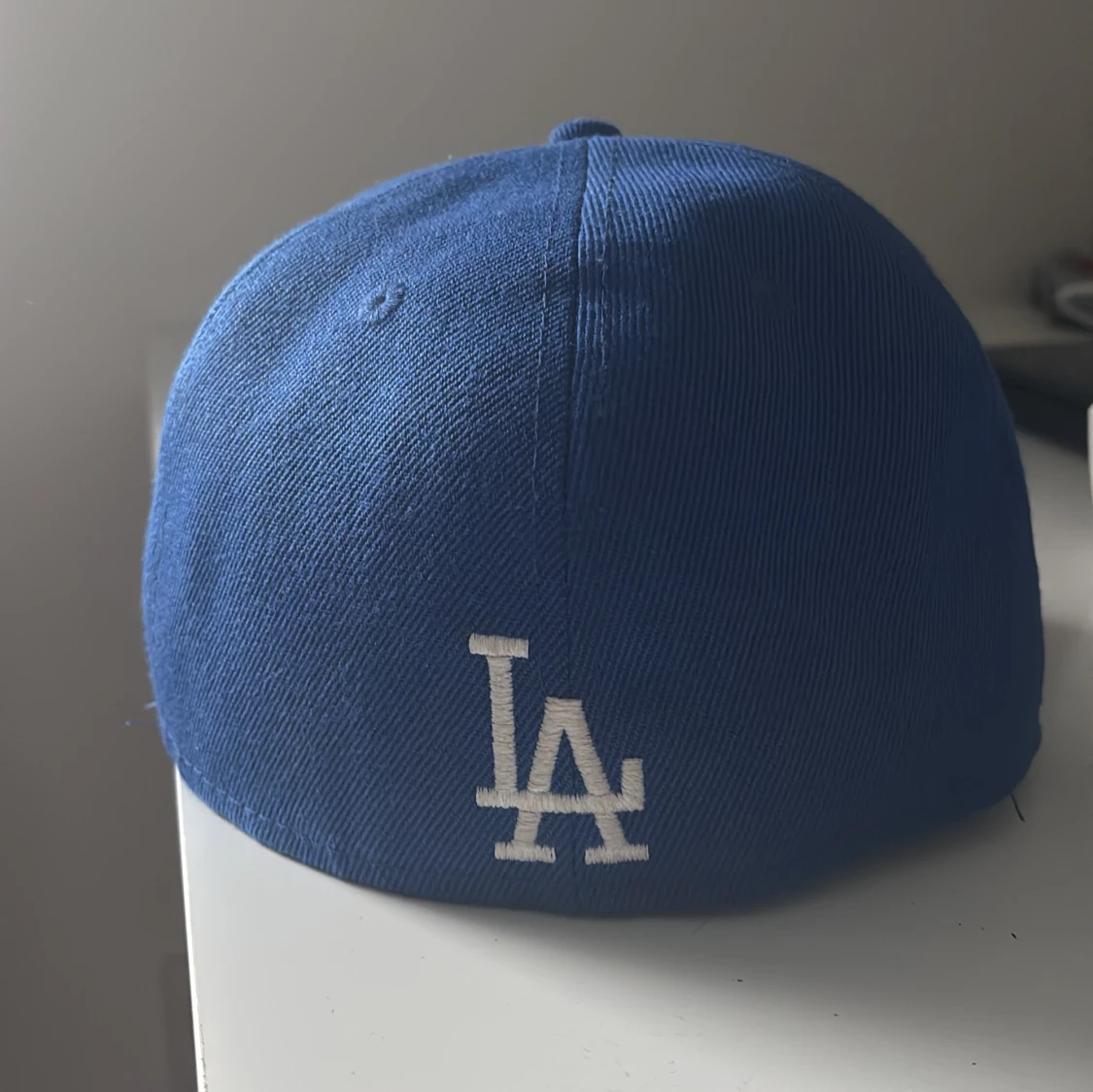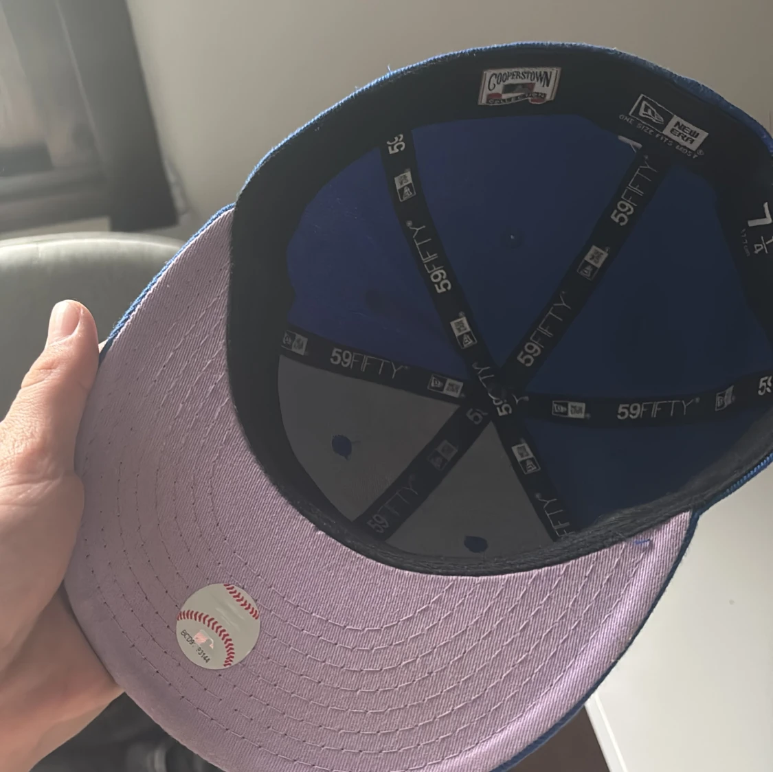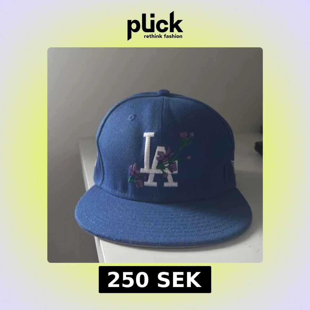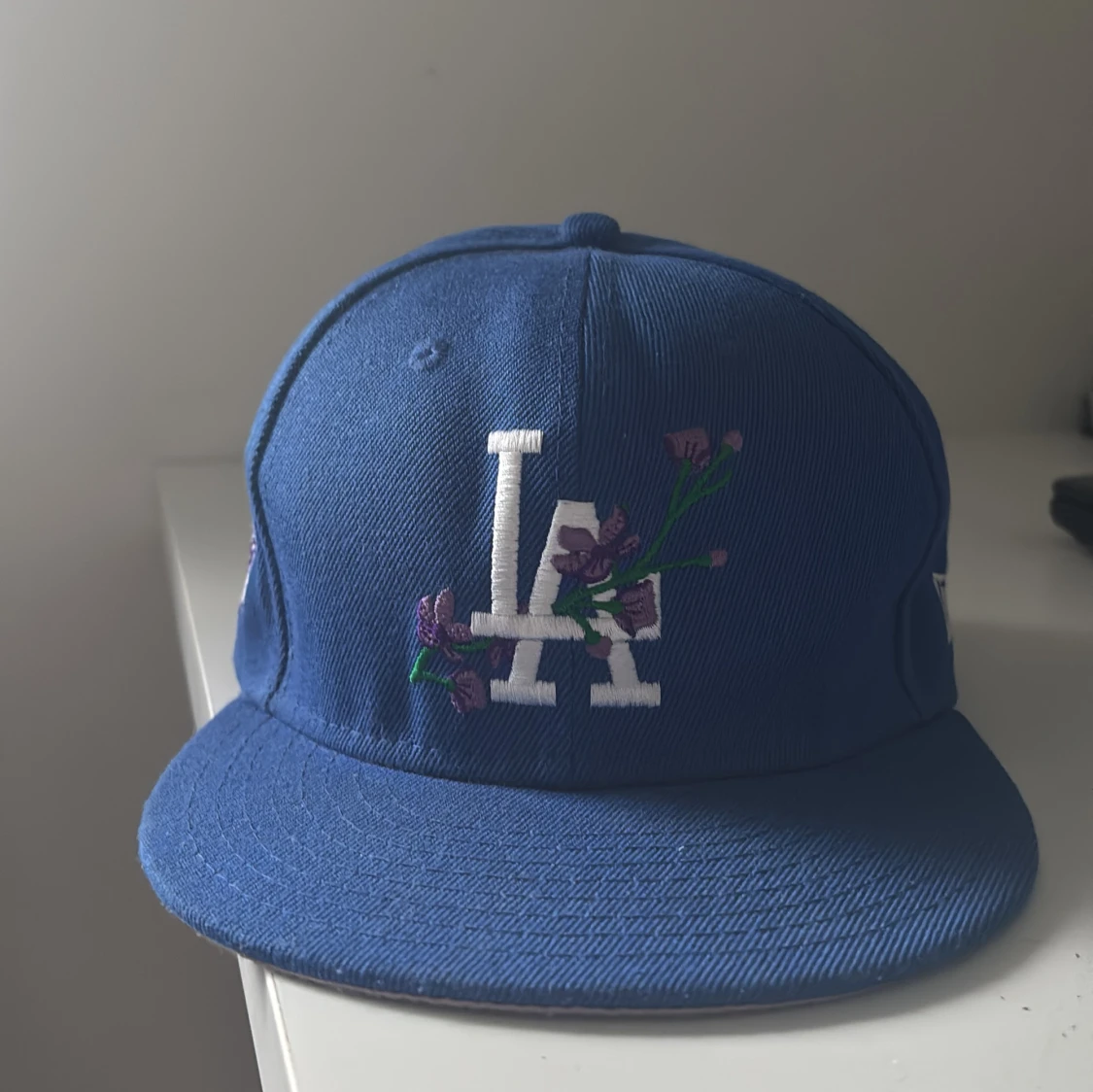 Snygg blå keps från New Era 59FIFTY med LA-logga framtill och baktill. Framtill är loggan dekorerad med broderade lila blommor och gröna detaljer. Priset är inte hugget i sten vid snabbt köp! Hör av dig vid frågor