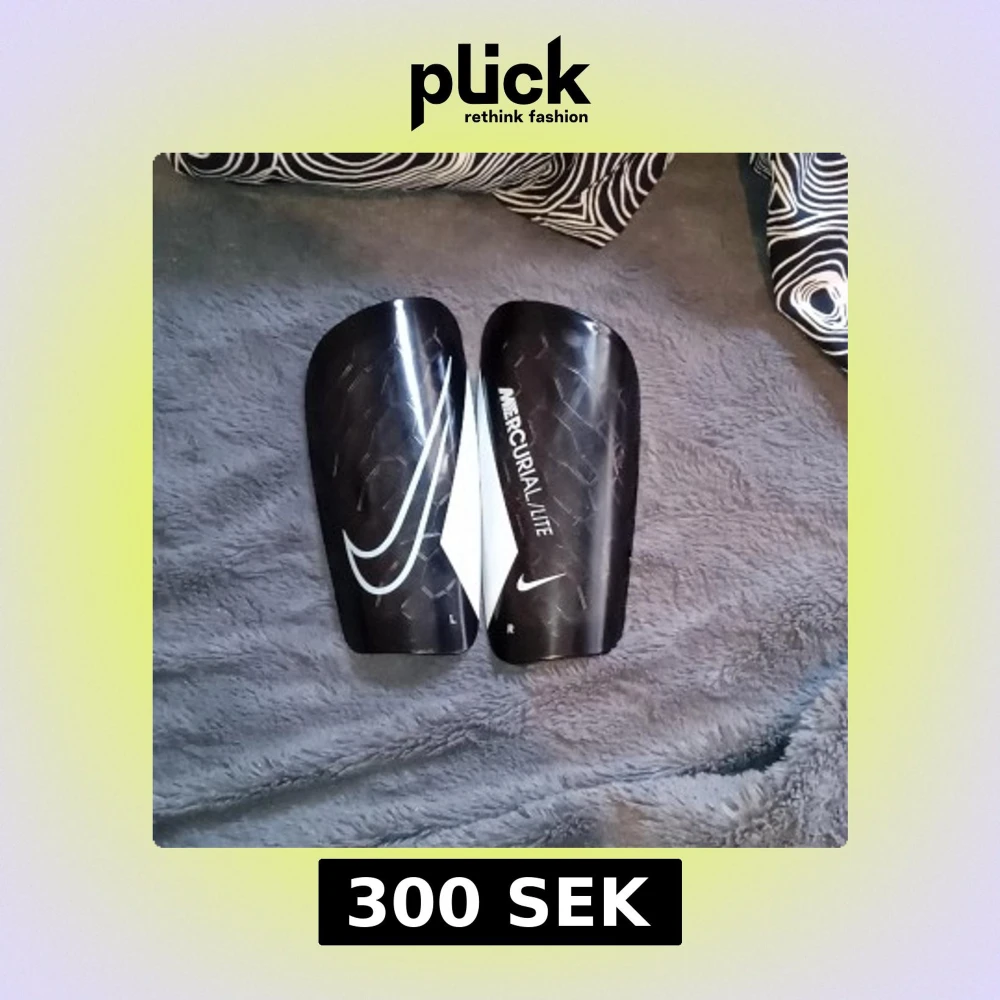 Säljer ett par svarta Nike Mercurial Lite benskydd med vitt swoosh-tryck och text. Kommer med tillhörande svart förvaringspåse. Lätta och smidiga med vadderad insida för extra komfort. Perfekta för fotbollsträning och match.