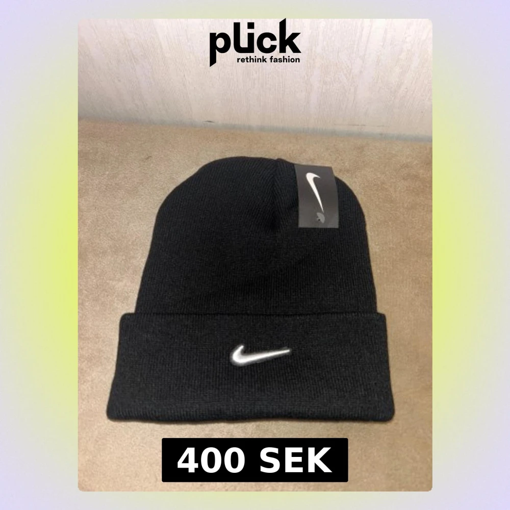 Svart mössa från Nike med klassisk vit broderad swoosh-logga framtill. Enkel och stilren design med uppvikt kant. Perfekt för kalla dagar och passar till streetwear. Materialet är mjukt och bekvämt, troligen stickad polyester.