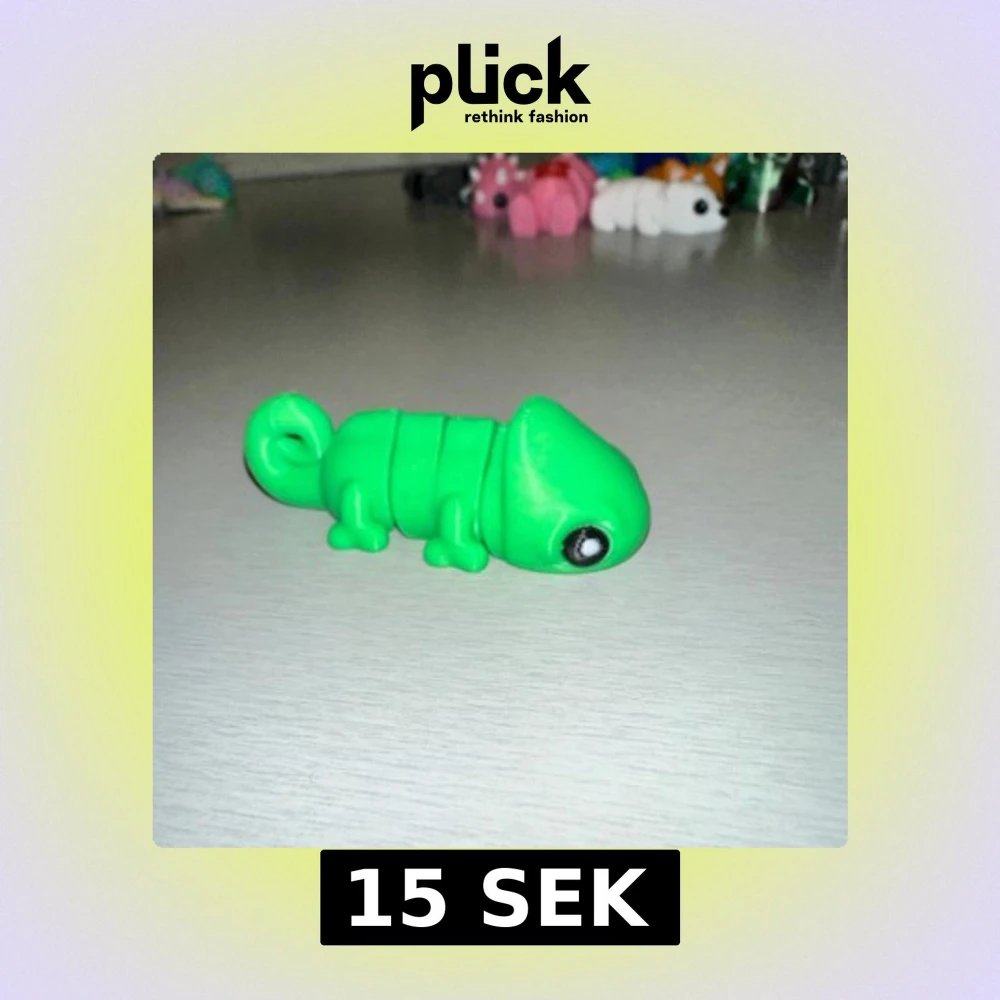 En söt liten grön kameleontfigur med stora svarta ögon. Perfekt som dekoration eller leksak. Den har en enkel och stilren design med en slät yta.
