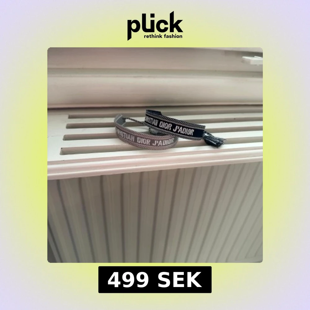 Två stilrena armband från Christian Dior med texten 'J'ADIOR'. Ett armband är i grått och det andra i svart, båda med vita detaljer. Perfekta för att ge en elegant touch till din stil.