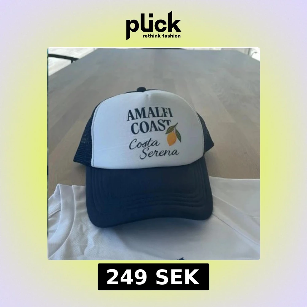 Snygg truckerkeps med vit front och blått nät bak. Framsidan har tryck med texten 'AMALFI COAST Costa Serena' och en citron. Böjd skärm och justerbar passform. Perfekt för sommarens äventyr och chill dagar.