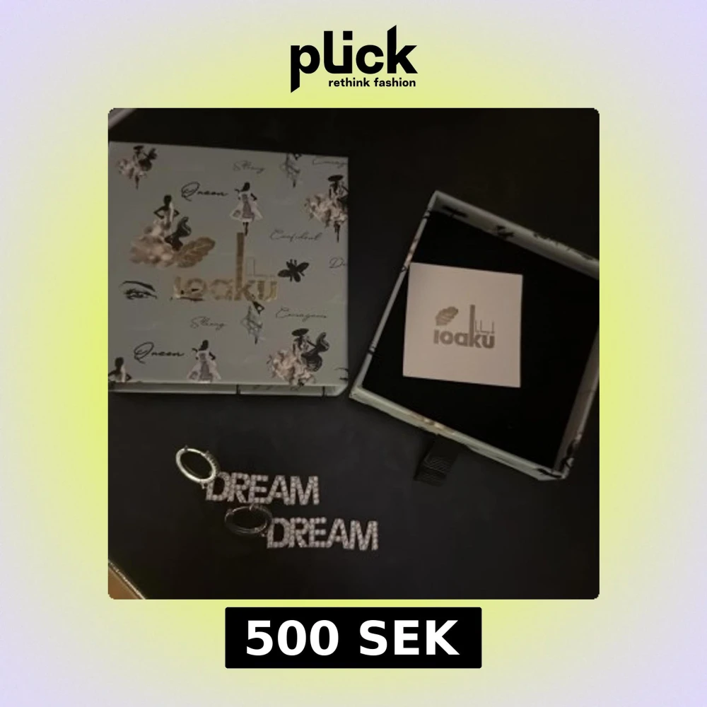 Säljer ett par statement örhängen från Ioaku med texten DREAM i stora bokstäver. Örhängena är silverfärgade och täckta av glittrande stenar som ger en lyxig vibe. Perfekt för dig som vill sticka ut och sprida good vibes.