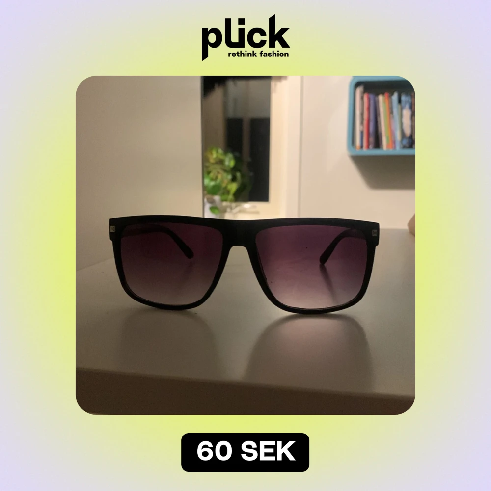 Säljer ett par ssvarta solglasögon med fyrkantig form och lila tonade linser. Perfekta för en solig dag. De är i bra skick och passar de flesta ansiktsformer. Perfekta för alla tillfällen