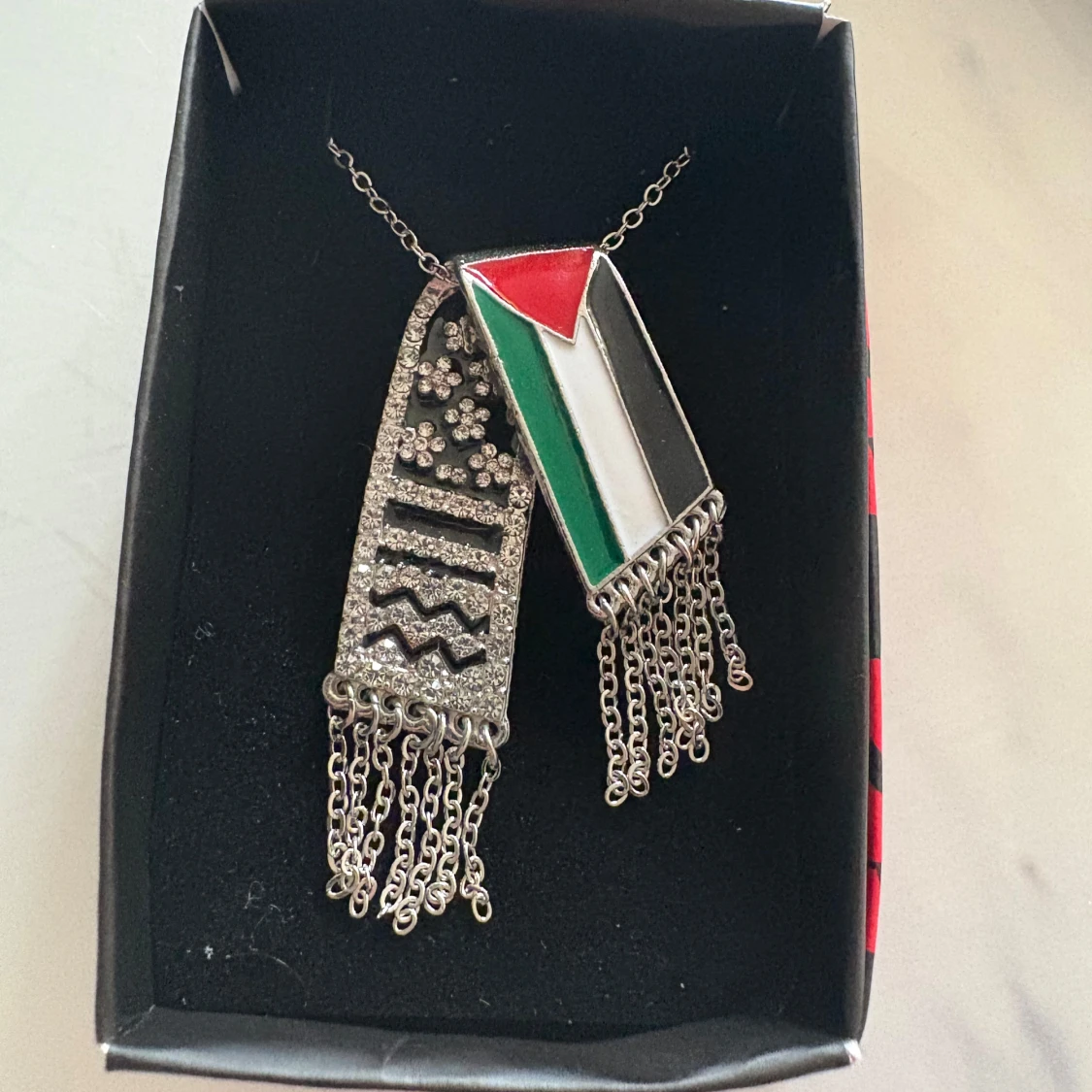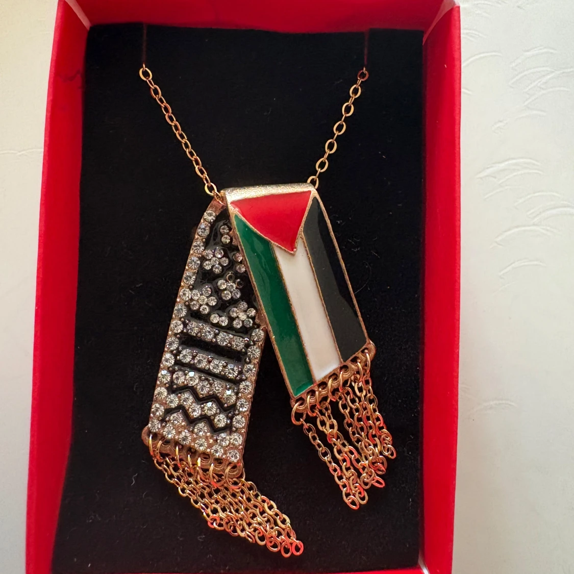 Unikt halsband med två hängande berlocker, en med Palestinas flagga i rött, grönt, svart och vitt, och en dekorerad med glittrande stenar och mönster. Båda har kedjefransar längst ner. Finns i både silver- och guldfärgad variant.