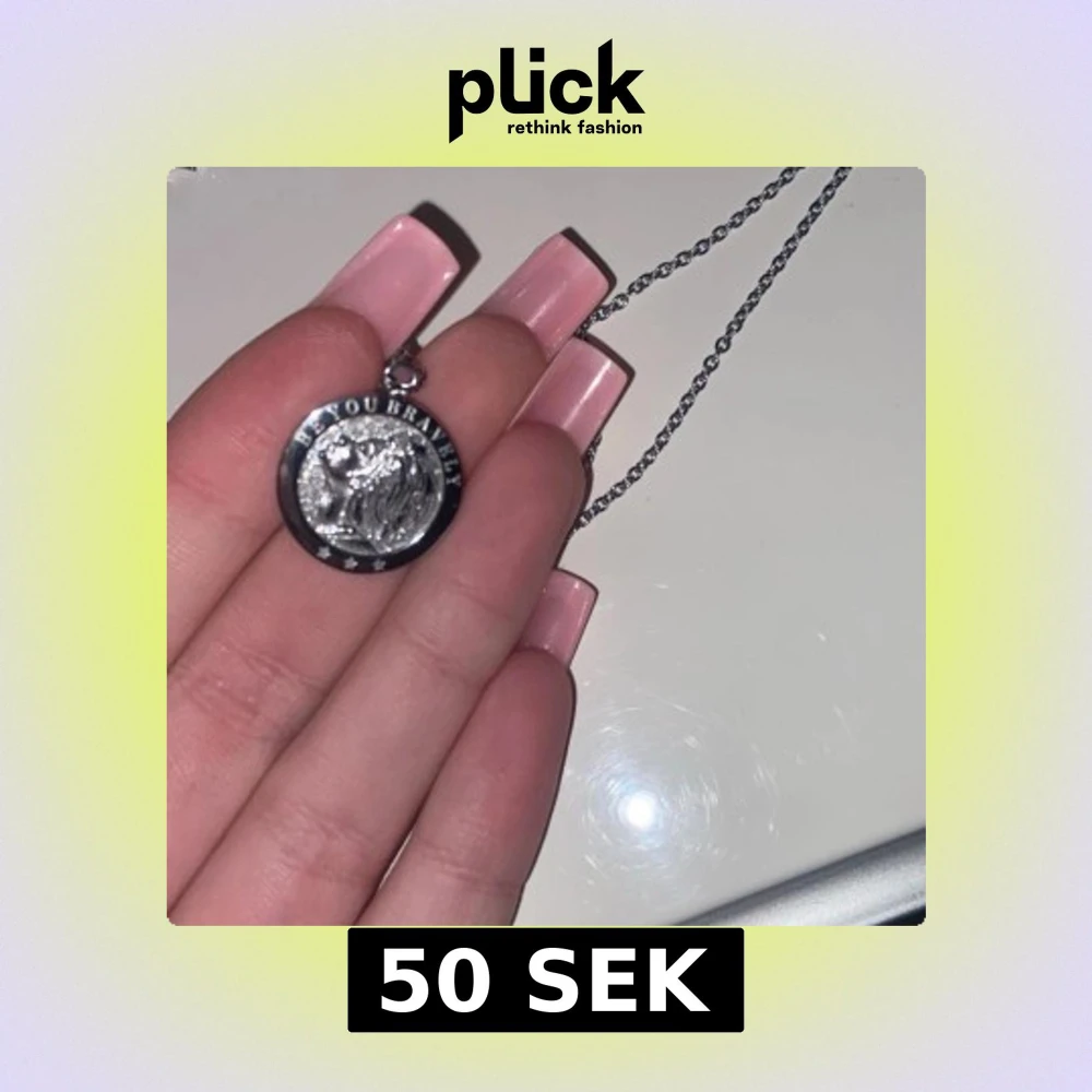 Snyggt silverfärgat mockberg halsband med en rund medaljong som har ett detaljerat motiv. Kedjan är tunn och elegant, vilket gör det perfekt för att bära varje dag eller vid speciella tillfällen. ❤️den är i bra skick