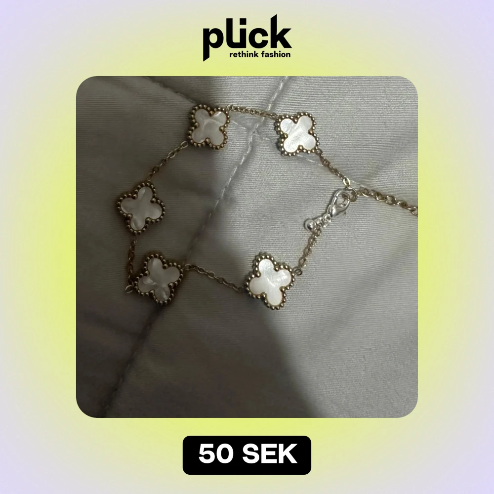Snyggt armband med fem fyrklöverformade hängen i vit och guld. Perfekt för att ge en elegant touch till vilken outfit som helst. Kedjan är fin och diskret, vilket gör det lätt att bära både till vardags och fest.