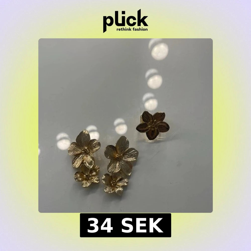 Säljer ett par riktigt snygga örhängen i guldton med blommig design. Varje örhänge har tre detaljerade blommor med fina strukturerade blad, perfekt för dig som vill sticka ut med något unikt och trendigt. Passar dig som gillar statement-smycken och blommiga detaljer.