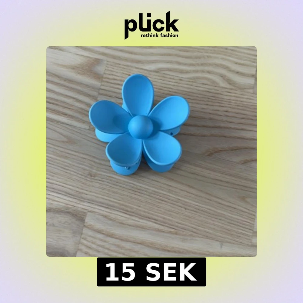 Säljer en söt blå hårklämma i form av en blomma med sex rundade kronblad. Perfekt för att ge din frisyr en färgglad och lekfull touch. Klämman är gjord av plast och har en mjuk, matt finish.
