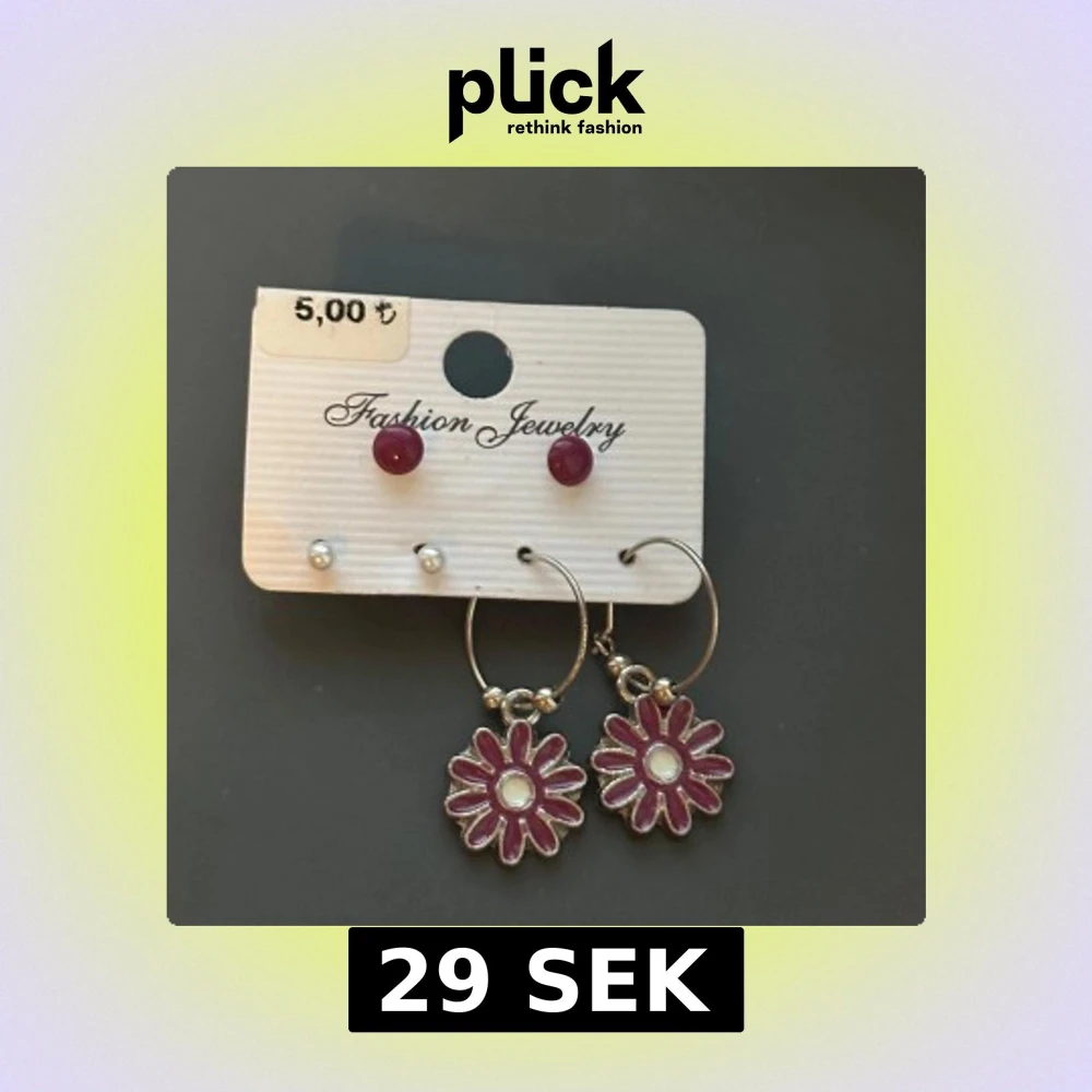 Skickar iväg samma dag eller dagen efter🙌🏼Set med fyra par örhängen: ett par silverfärgade hoops med hängande blommor i lila och vitt, ett par små lila studs och ett par små vita pärlstuds. Blommorna har en söt retrostil och hoopsen är i metall. Perfekt för dig som gillar att mixa och matcha.