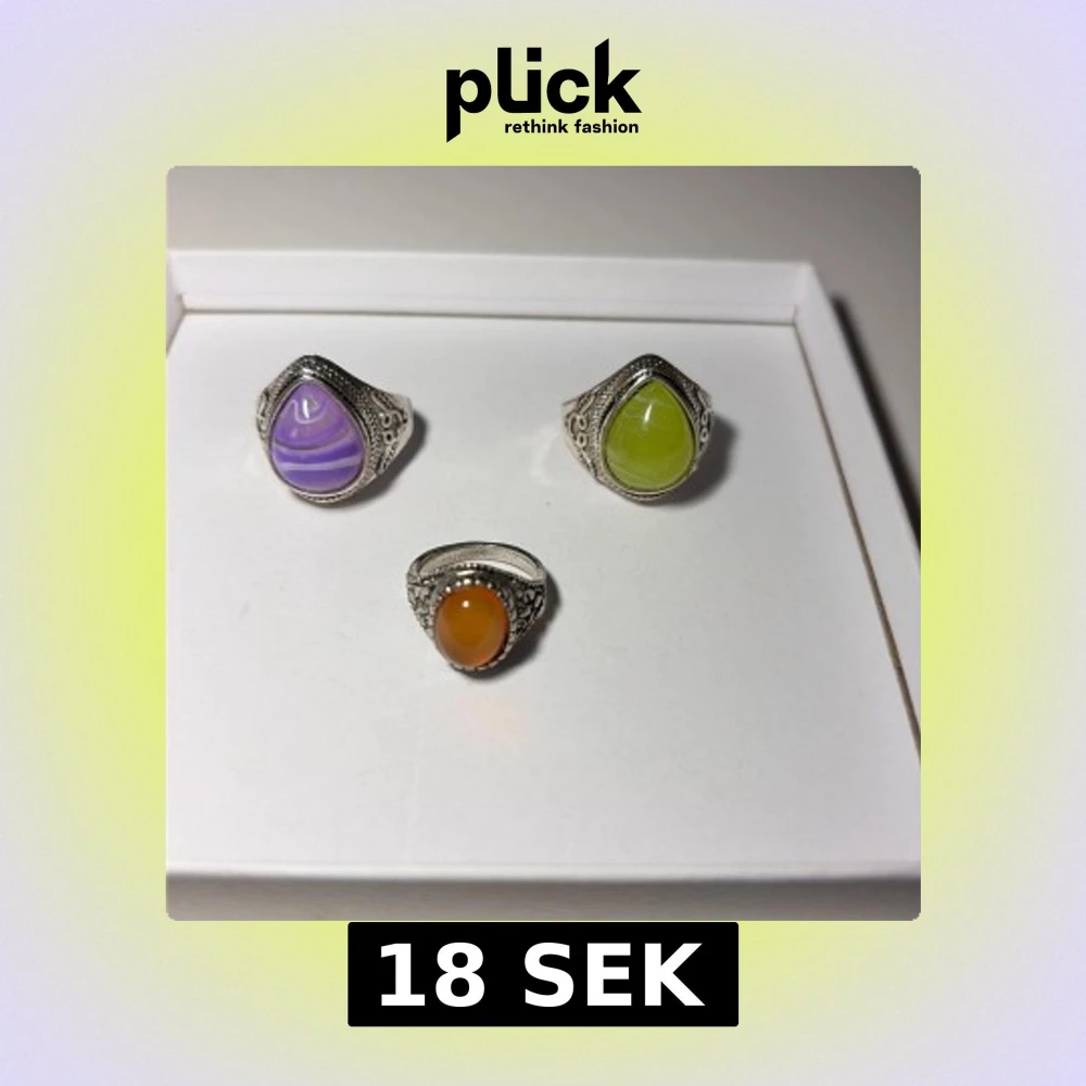 Tre snygga silverringar med stora stenar i lila, grön och orange. Ringarna har detaljerade mönster runt infattningen och stenar i dropp- och ovalform. Perfekt för dig som vill sticka ut med färgglada accessoarer.