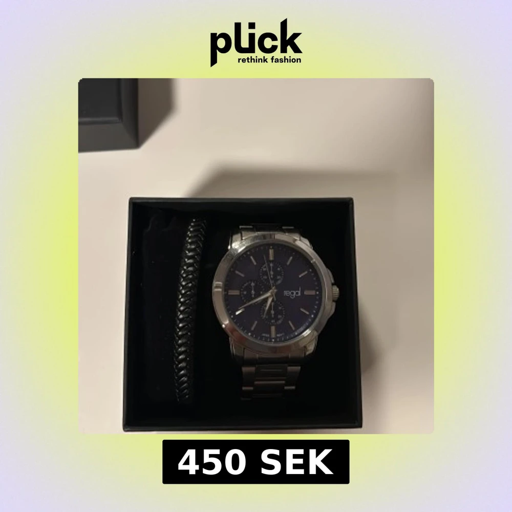 Snygg klocka från Regal med marinblå urtavla och silverfärgad länk i metall. Klockan har flera små urtavlor och stilrena indexmarkeringar. Levereras i originalask med extra länkbitar och svart armband i flätad design.