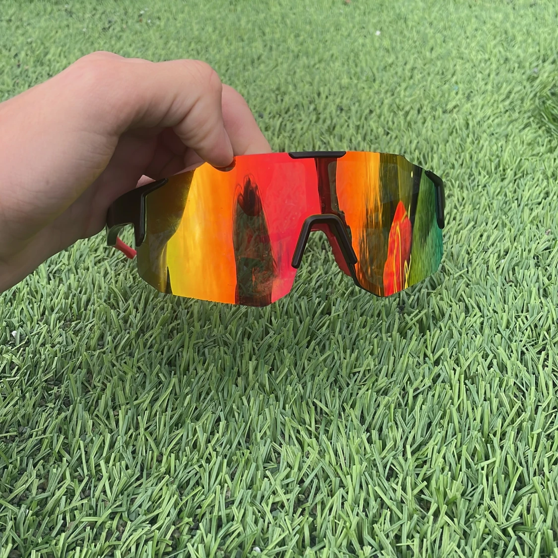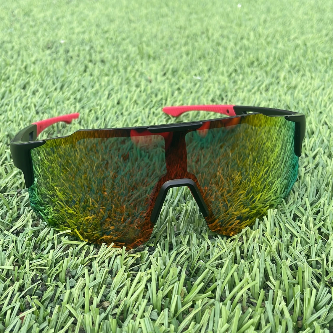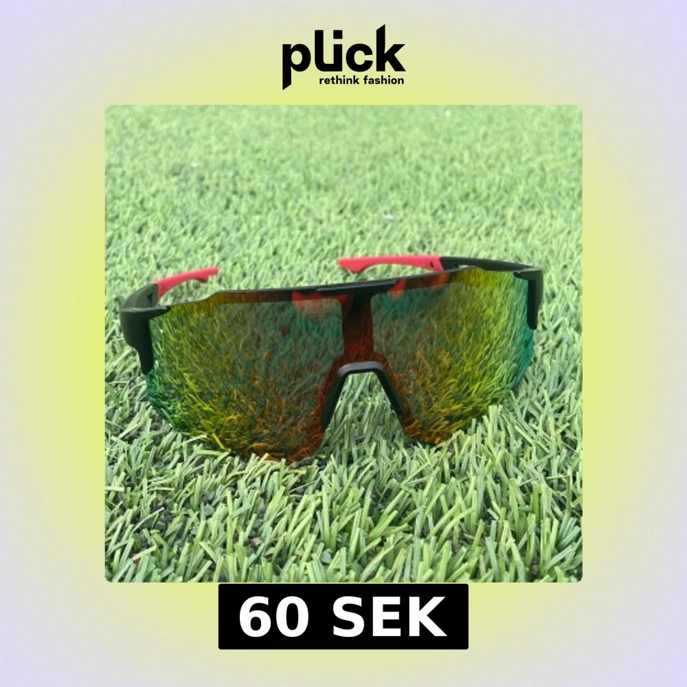 Säljer ett par sportiga solglasögon med stora, spegelblanka linser i regnbågsfärger. Bågarna är svarta med röda skalmar och näsbrygga. Perfekta för utomhusaktiviteter och har en modern, oversized design.