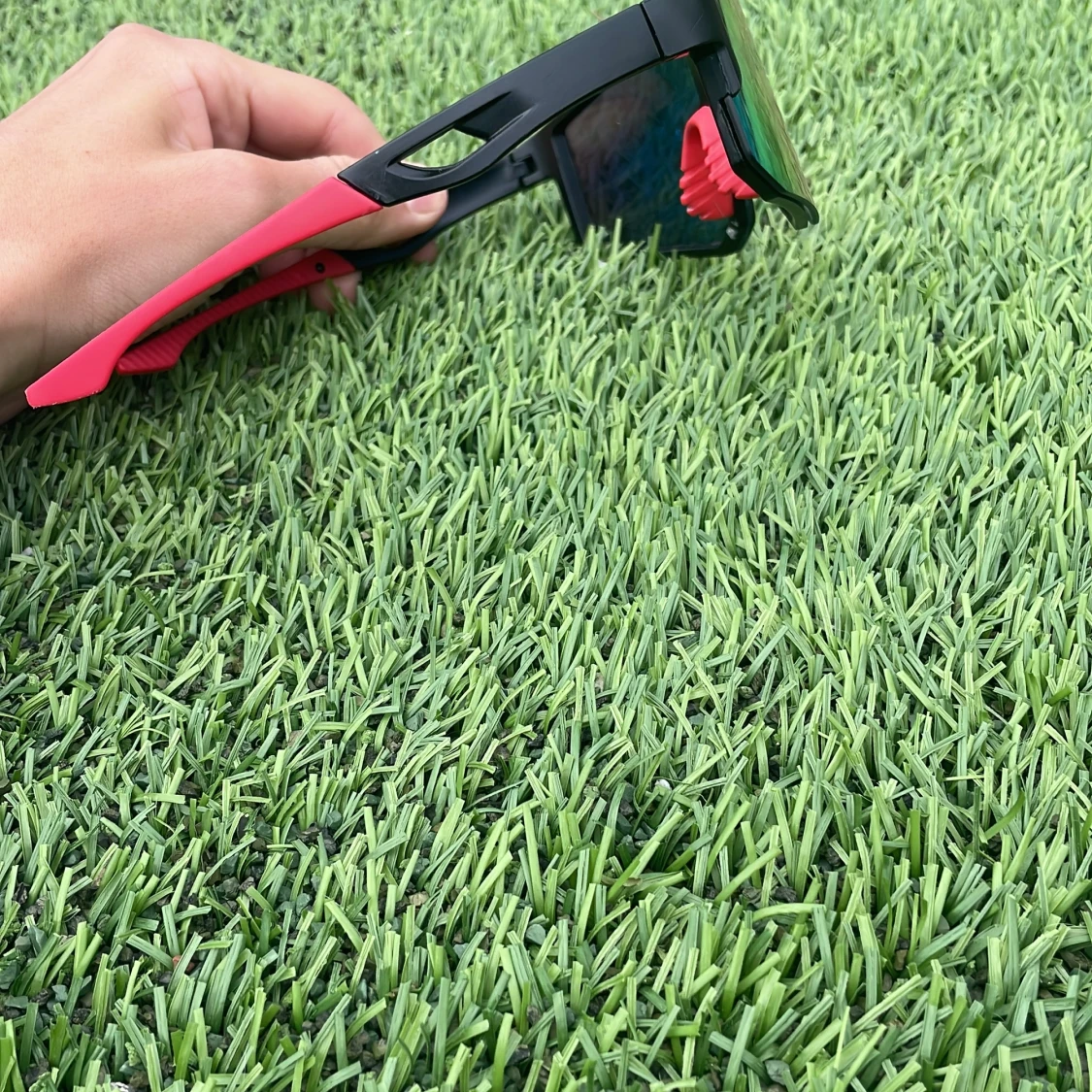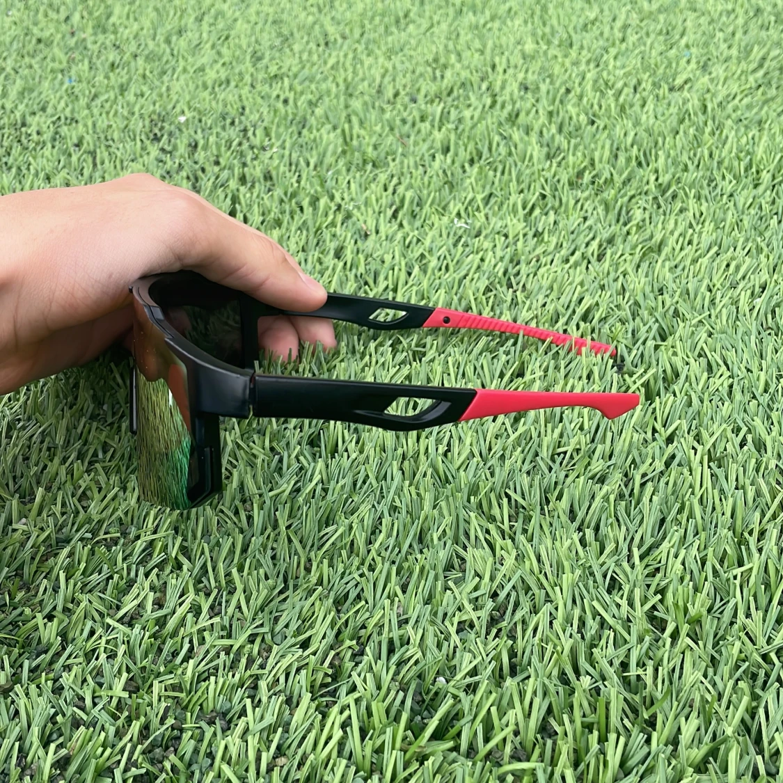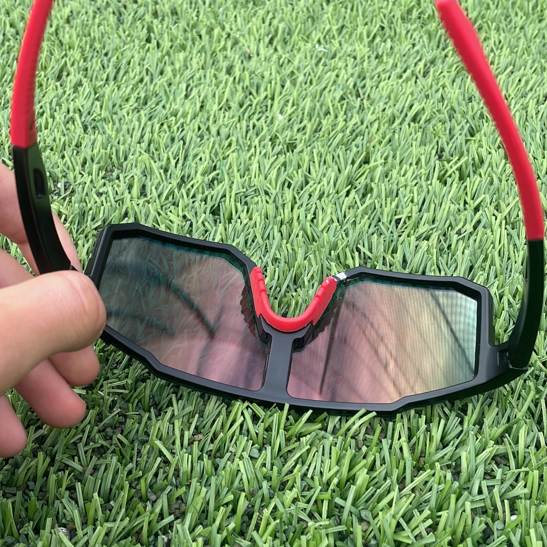 Säljer ett par sportiga solglasögon med stora, spegelblanka linser i regnbågsfärger. Bågarna är svarta med röda skalmar och näsbrygga. Perfekta för utomhusaktiviteter och har en modern, oversized design.