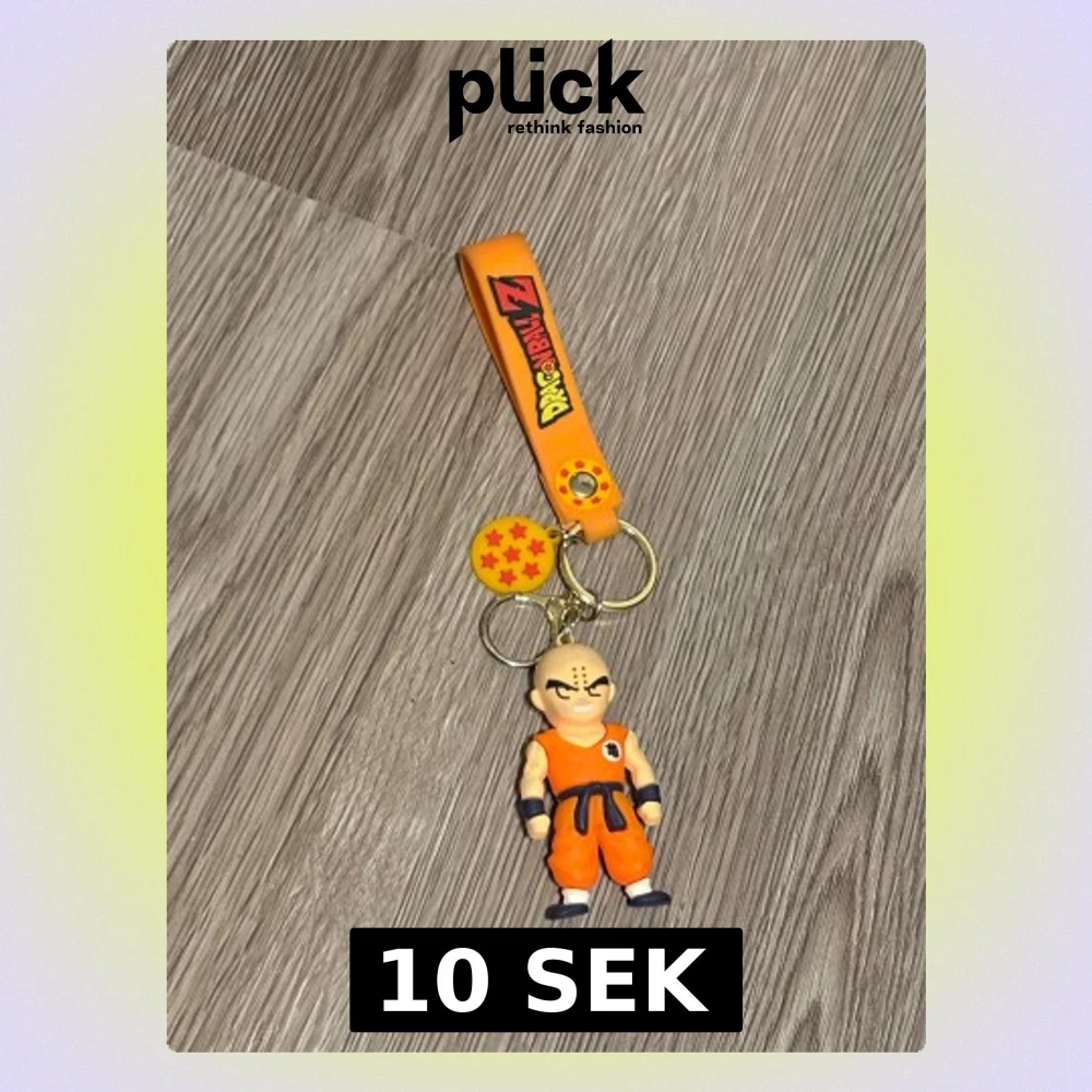 Nyckelring med Krillin från Dragon Ball Z. Figurerad i orange dräkt med mörkblå detaljer och japanskt tecken på bröstet och ryggen. Nyckelringen har även en orange rem med Dragon Ball Z-logga och en gul drakkula med röda stjärnor. Perfekt för animefans! Dock har den blivit missfärgad och tappat lite guldfärg.