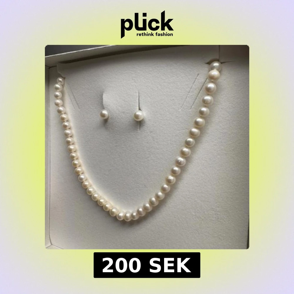 Säljer ett elegant set med halsband och örhängen i äkta vita pärlor. Halsbandet består av runda pärlor i jämn storlek och örhängena är enkla pärlknoppar. Perfekt för dig som gillar tidlös och stilren design. Köpts från Albrekts guld