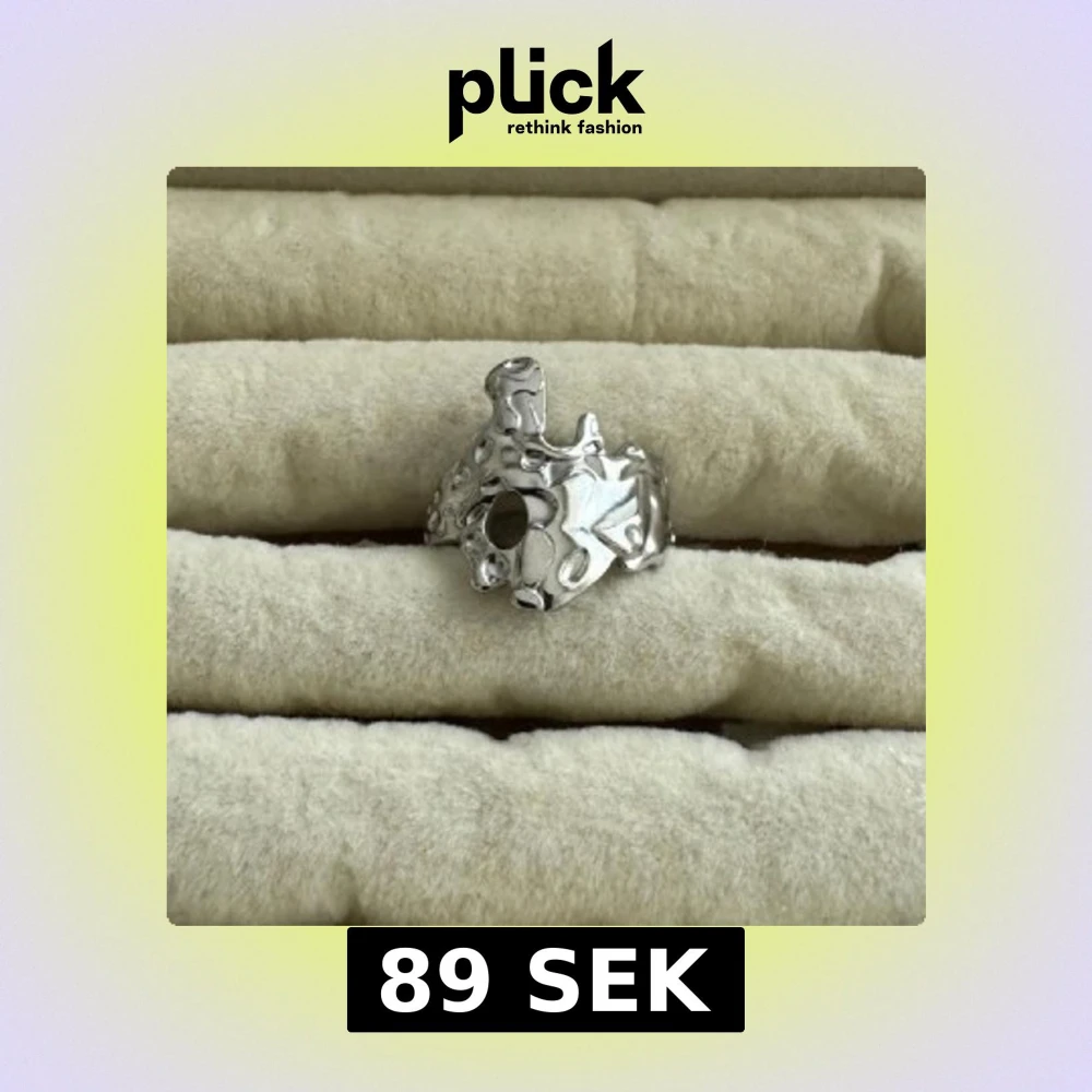 Säljer en cool och unik ring i silver med en organisk, abstrakt design. Ringen har en skulptural yta med hål och vågiga detaljer som ger den ett edgy och konstnärligt uttryck. Perfekt för dig som gillar statement-smycken och vill sticka ut.
