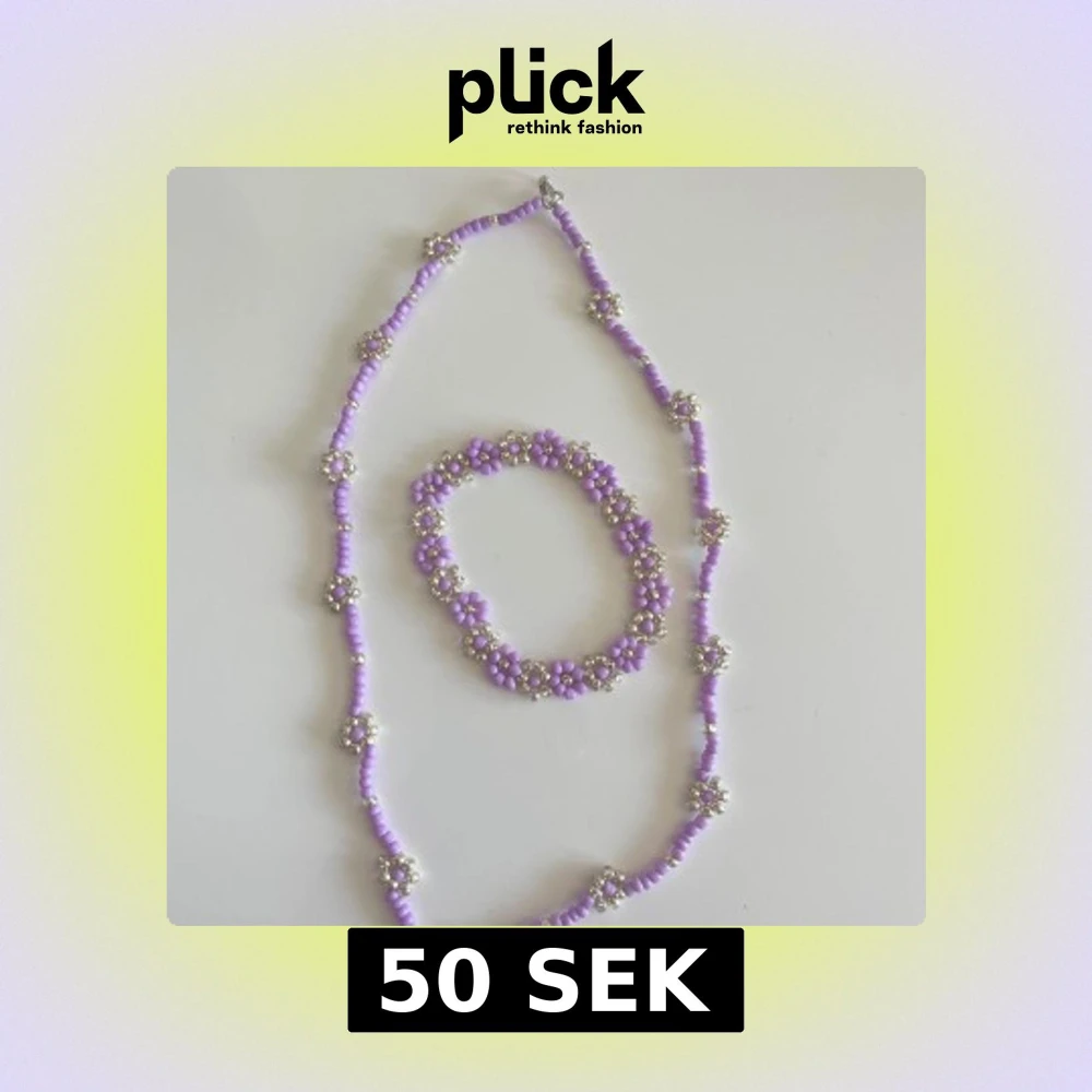 Supergulligt set med halsband och armband i lila och silverfärgade pärlor. Båda smyckena har små blommor av pärlor som ger en söt och lekfull vibe. Perfekt för att piffa upp din outfit med lite färg och charm.