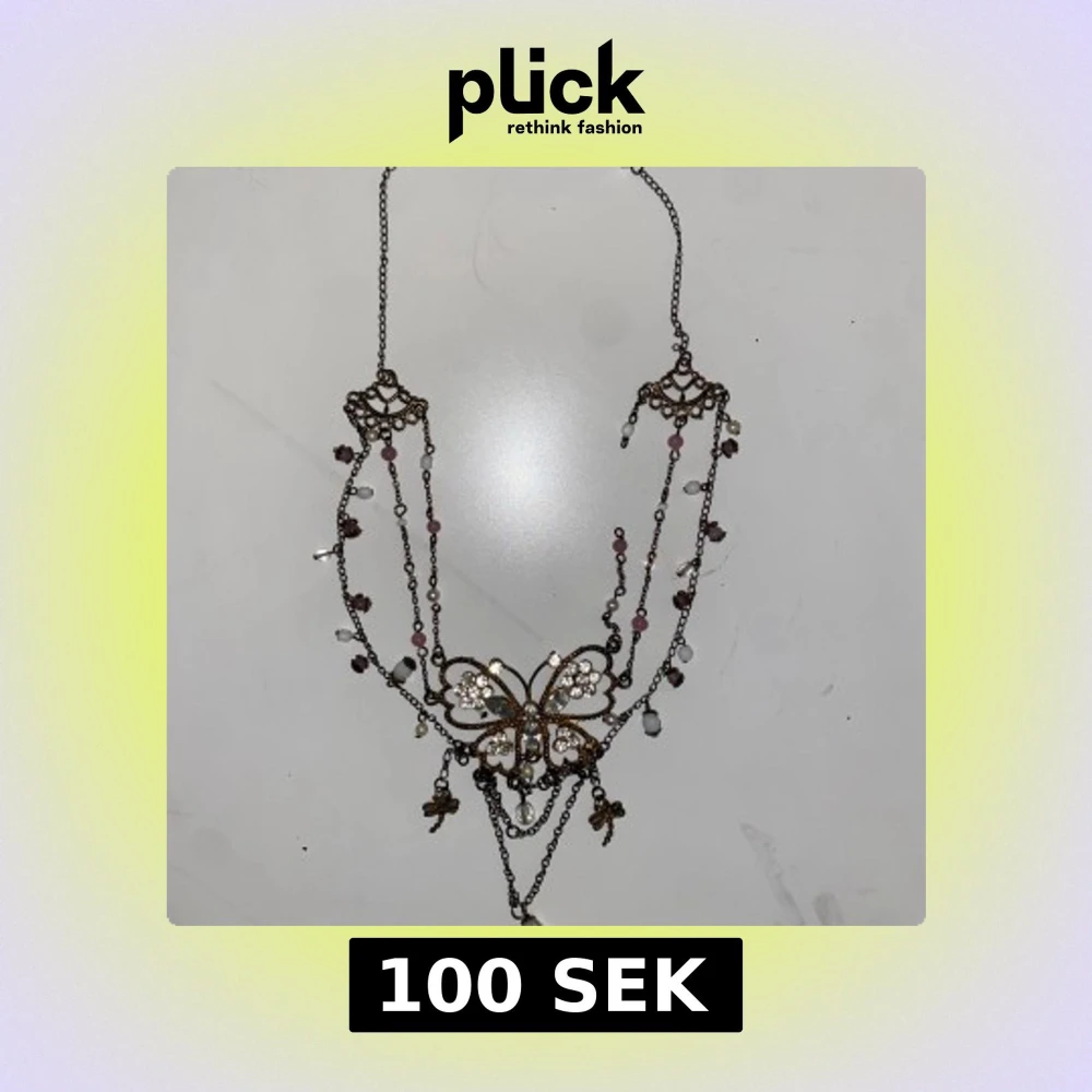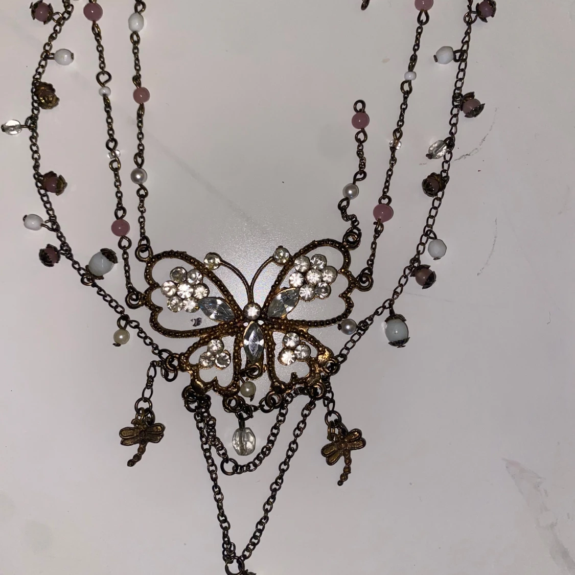 Unikt halsband med antikguld kedja, dekorerat med pärlor i vitt och rosa samt små glittriga stenar. Mittdelen har en stor fjäril med strass och hängande berlocker, bland annat små trollsländor. Romantisk och bohemisk vibe, perfekt för dig som gillar detaljer. Ena kedjan på högra sidan var trasig (se bild 3) när jag köpte den second hand innan, men borde inte vara svårt att knipsa ihop 🤞🏽🤞🏽