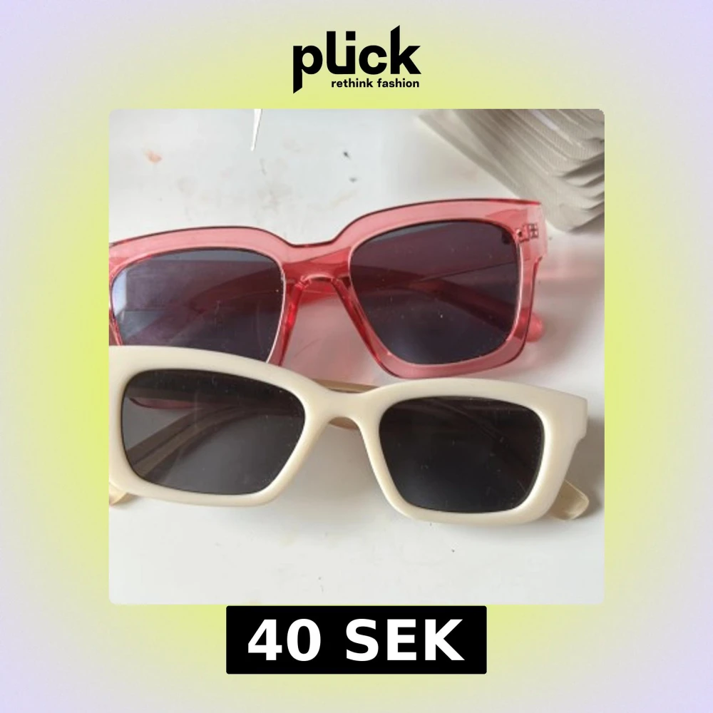 Säljer två par solglasögon med rektangulära bågar, ett par i transparent rosa och ett par i matt vit. Båda har mörka glas och cool, chunky design som ger en riktigt modern vibe. Perfekta accessoarer för att lyfta din stil i sommar.