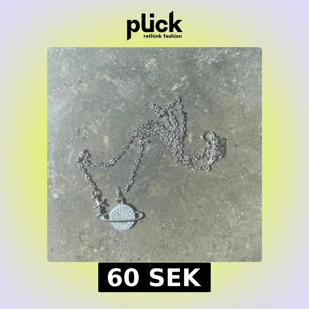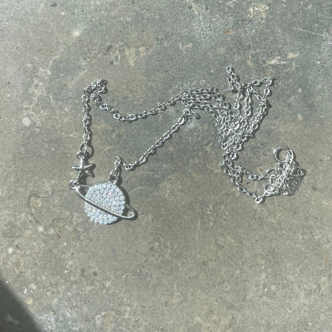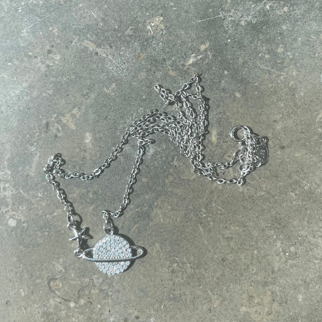 Ett snyggt silverfärgat halsband med ett glittrigt planet-hänge och en liten stjärna bredvid. Kedjan är tunn och smidig, och planeten är täckt av små gnistrande stenar som ger extra bling. Perfekt för dig som gillar rymdtema och vill sticka ut lite extra.