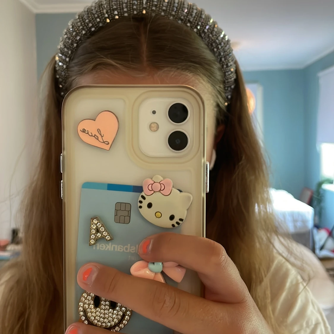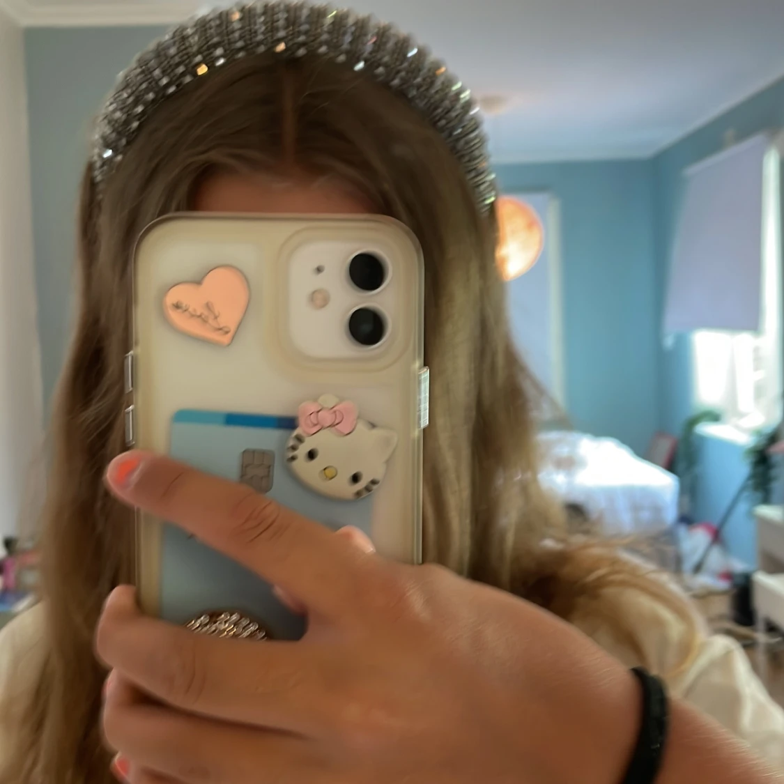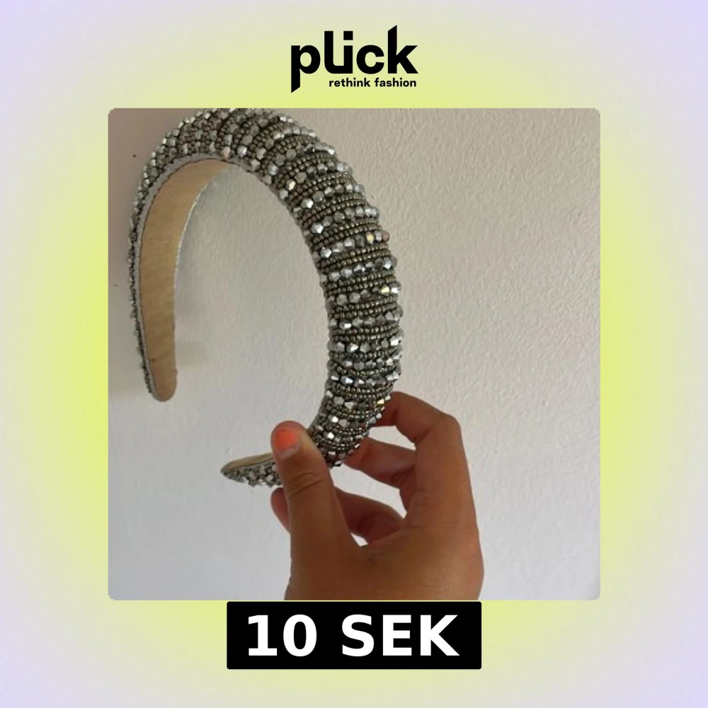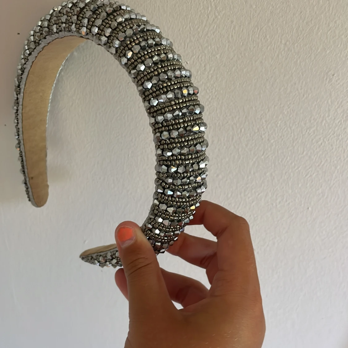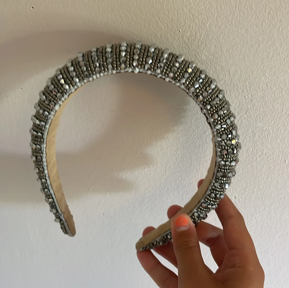 Säljer ett chunky diadem täckt av glittrande silverfärgade pärlor och stenar. Diademet är brett och ger en riktigt statement-look, perfekt om du vill sticka ut. Insidan är klädd i beige tyg för extra komfort. Superfint till både utsläppt och uppsatt hår.